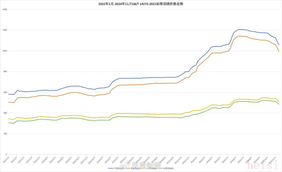 作為羽絨服的主要原材料,羽絨價格上漲成為從供應端到零售端都大倒苦水的“重因”。周偉告訴貝殼財經記者,自2022年4月羽絨服執(zhí)行新國標以來,羽絨的價格就一路上漲。