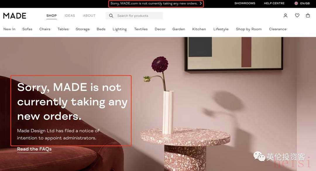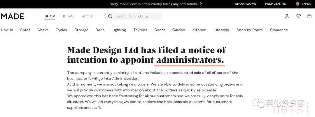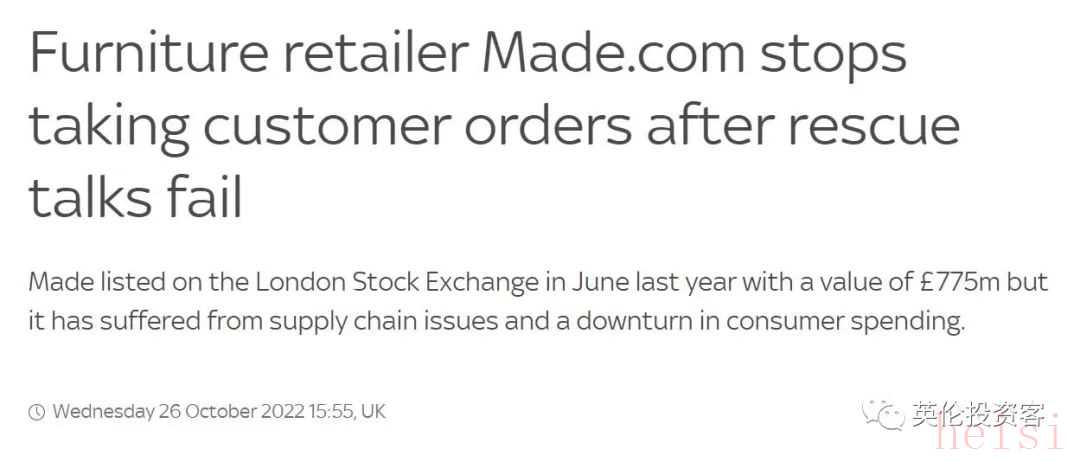 一周之前(2022年10月25日),Made.com在結(jié)束了與潛在買家沒有結(jié)果的談判后,于第二天(10月26日)關(guān)閉網(wǎng)站、暫停新客戶訂單、停止在倫交所交易。