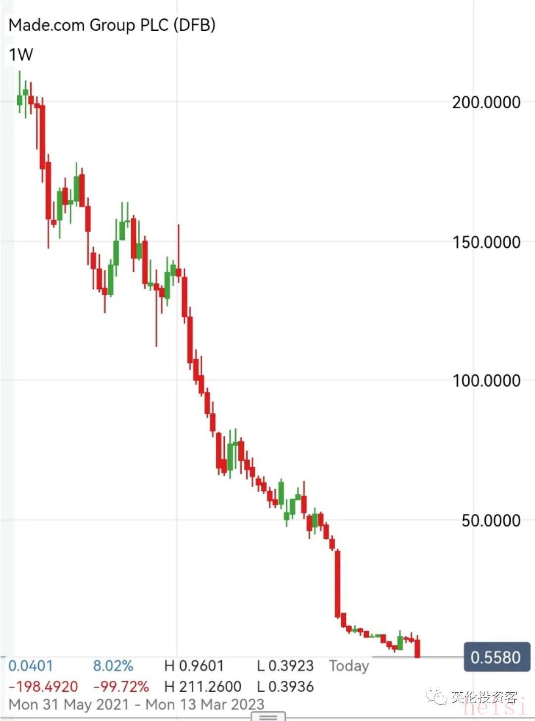 令人詫異的是,自那以后,Made.com的股價(jià)就呈現(xiàn)斷崖式下跌,迄今為止股價(jià)已經(jīng)從剛上市的200便士跌至0.5便士,跌幅高達(dá)驚人的99.5%。