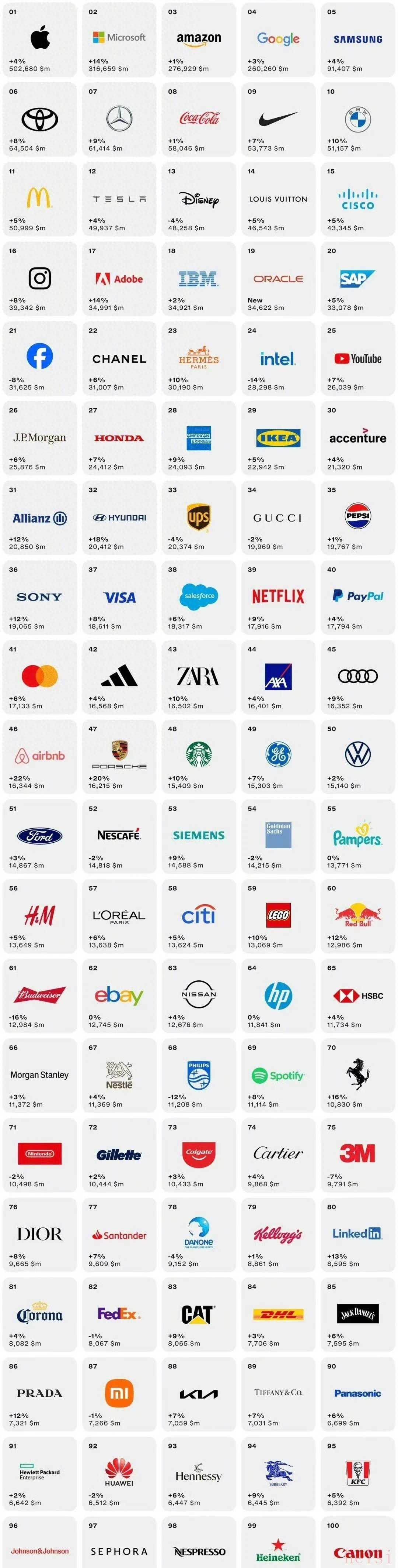 Interbrand 在其官方新聞稿中介紹,這份榜單揭示出許多世界百強品牌正處于“停滯不前”的狀態(tài),榜單的整體品牌價值在去年大幅增長之后,增速開始出現(xiàn)急劇放緩。與去年 16% 的增幅相比,今年的增幅為 5.7%,品牌總價值為 3.3 萬億美元(IT之家備注:當(dāng)前約 23.59 萬億元人民幣)。IT之家注:作為參考,2022 年的品牌總價值為 3.1 萬億美元(當(dāng)前約 22.16 萬億元人民幣)。Interbrand 全球 CEO 貢薩洛?布魯霍表示,在經(jīng)歷了數(shù)年的強勁增長之后,各品牌已經(jīng)進入了停滯期,今年榜單顯示整體品牌價值“適度增長”。該機構(gòu)還認(rèn)為,品牌增長放緩的原因包括缺乏增長思維、領(lǐng)導(dǎo)力較弱及預(yù)測不力等方面。值得一提的是,華為、小米兩家中國企業(yè)今年再度進入榜單,分別位列第 87 名和第 92 名,相比 2022 年的名次均出現(xiàn)下滑:去年小米排名第 84、華為第 86。