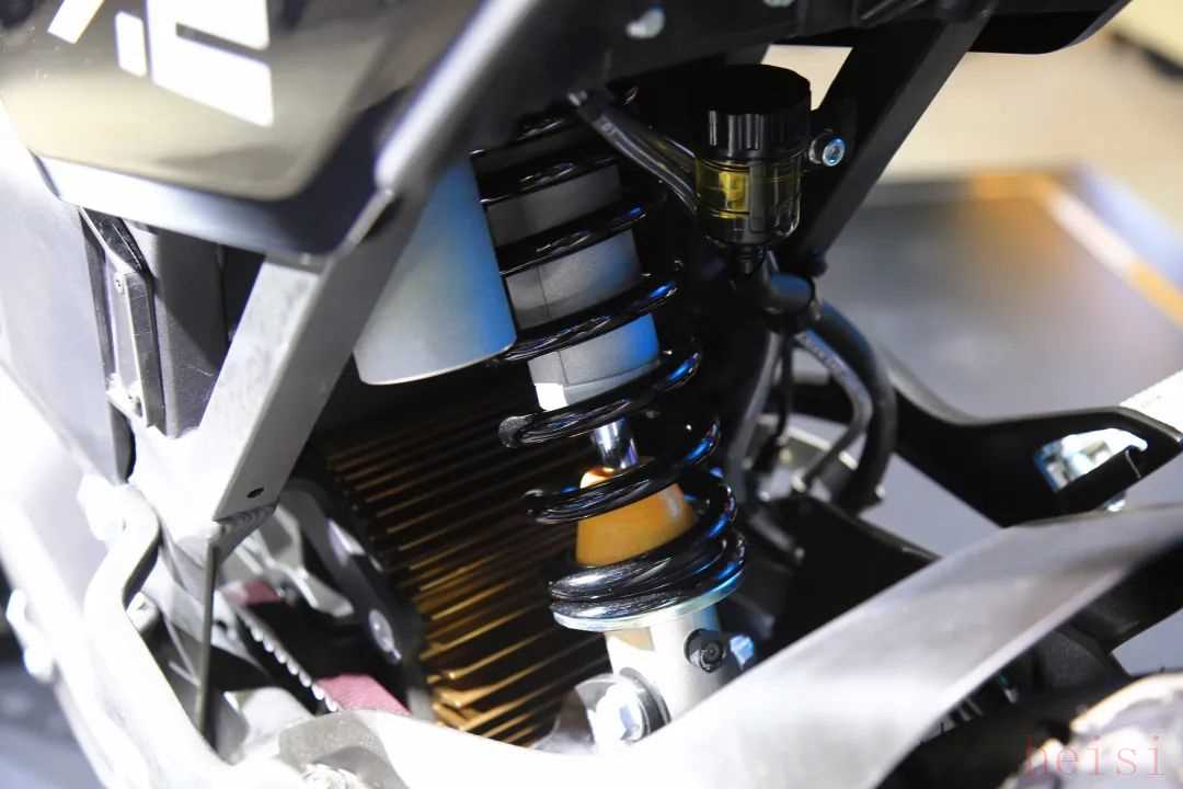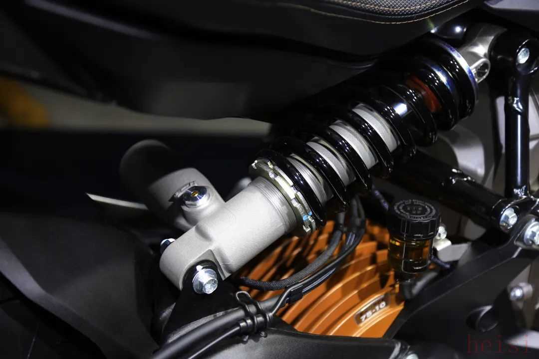 車身方面FXE采用SHOWA 41mm倒立式前叉,支持預(yù)載、壓縮和回彈阻尼全可調(diào),后部為帶氣瓶的全可調(diào)減震,前后減震分別有178mm和227mm的減震行程。制動方面采用西互雙活塞卡鉗配320mm制動盤,后制動為西互單活塞卡鉗配240mm制動盤,標配博世ABS。輪胎選用倍耐力惡魔2,前輪規(guī)格110/70-17,后輪規(guī)格140/70-17。
