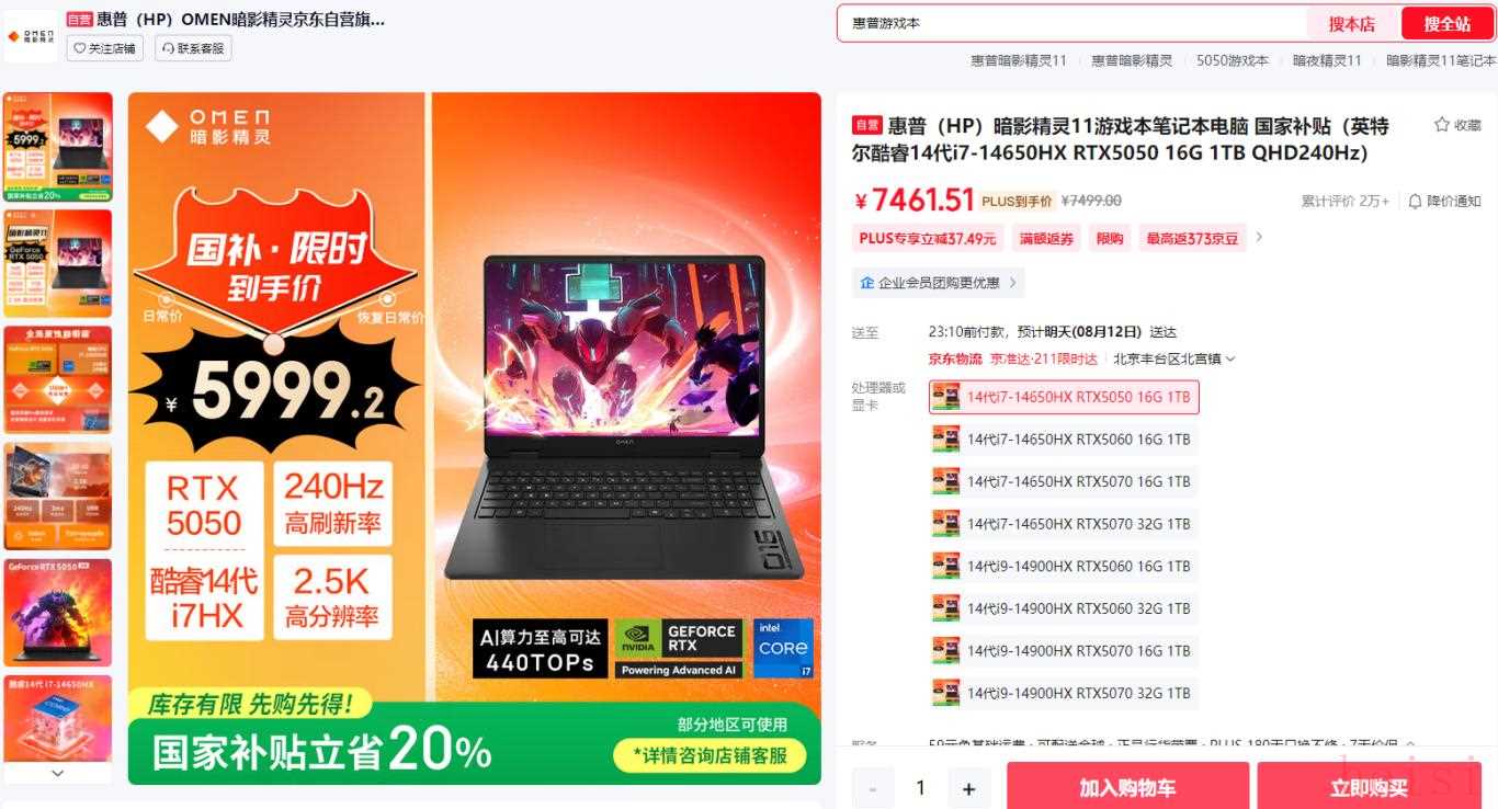 目前這樣一款產品,無論是質價比還是性價比都非常優(yōu)秀。OMEN暗影精靈11一共有三款顯卡配置,從RTX 5050到RTX 5070。最基礎的i7-14650HX+RTX 5050版定價為7499元,疊加國補后僅需5999.2元,不到6000元的價格在一線品牌中優(yōu)勢非常明顯。而最主流的i7-14650HX+RTX 5060版,國補后到手價也只有6319.2元。可以說OMEN暗影精靈11可以為玩家提供一線品牌的硬件素質和售后,價格卻只要二三線品牌的定價,絕對是學生黨適合的游戲筆記本中的不二之選。