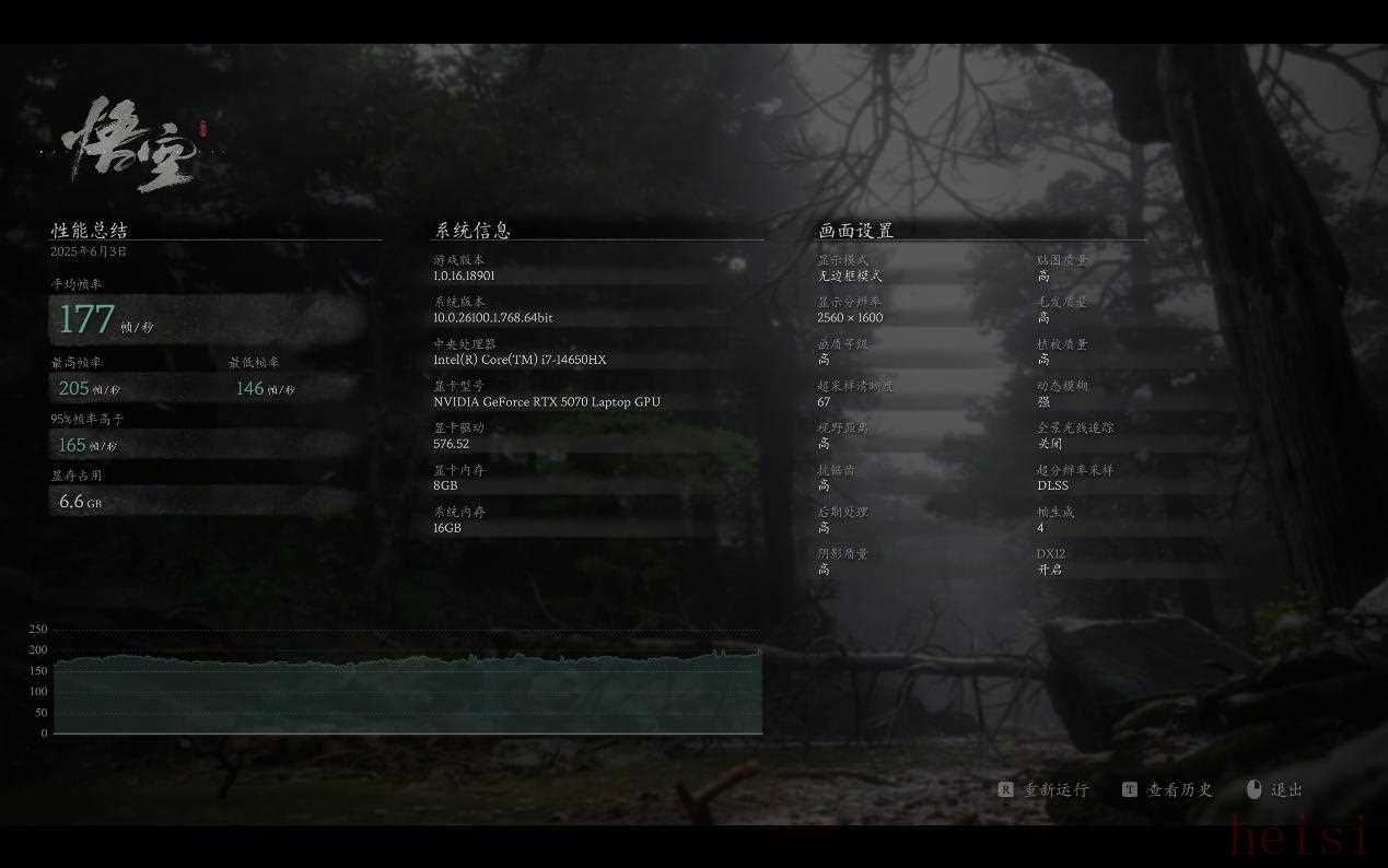 實測在《黑神話:》的Benchmark中,開啟DLSS質量+DLSS 4 4倍多幀生成設置,分辨率置為2560x1600、高畫質下,OMEN暗影精靈11的平均成績達到了177幀,流暢度相當不錯,對于一款3A大作來說,這個流暢度完全夠用。