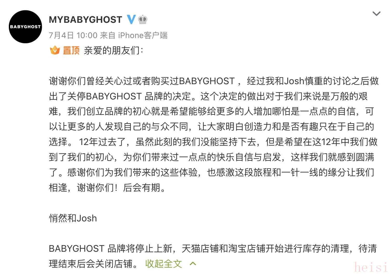 7月4日,獨立設(shè)計師品牌Babyghost在官方微博發(fā)布聲明稱,兩位創(chuàng)始人黃悄然和Joshua Hupper已決定將停止品牌運營。