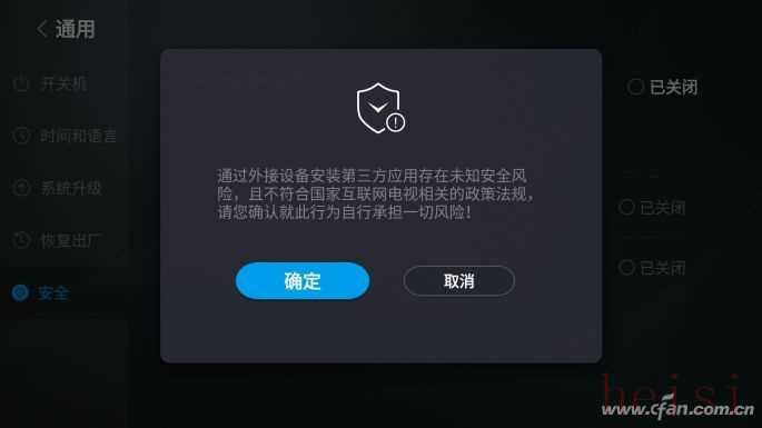 OTT電視盒子默認(rèn)是禁止安裝第三方APP的,需要進(jìn)入系統(tǒng)設(shè)置的安全選項(xiàng),開啟運(yùn)行安裝未知來源應(yīng)用的選項(xiàng)(圖15)。此外,還有一些產(chǎn)品會(huì)選擇更嚴(yán)格的屏蔽方法,遇到這種情況我們可以通過網(wǎng)上教程查詢破解方案。