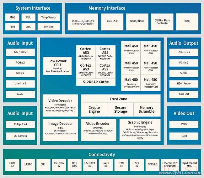 作為昔日的平板電腦芯片供應(yīng)商,全志在向OTT盒子轉(zhuǎn)型時(shí)最早加入了4K硬解碼和3D視頻合成的概念。全志OTT處理器以H3、H5和H8為主,其中H3和H8都是老舊的Cortex-A7架構(gòu)設(shè)計(jì),而H5則升級(jí)到了最新Cortex-A53架構(gòu),并集成Mali-450MP6GPU(圖10)。