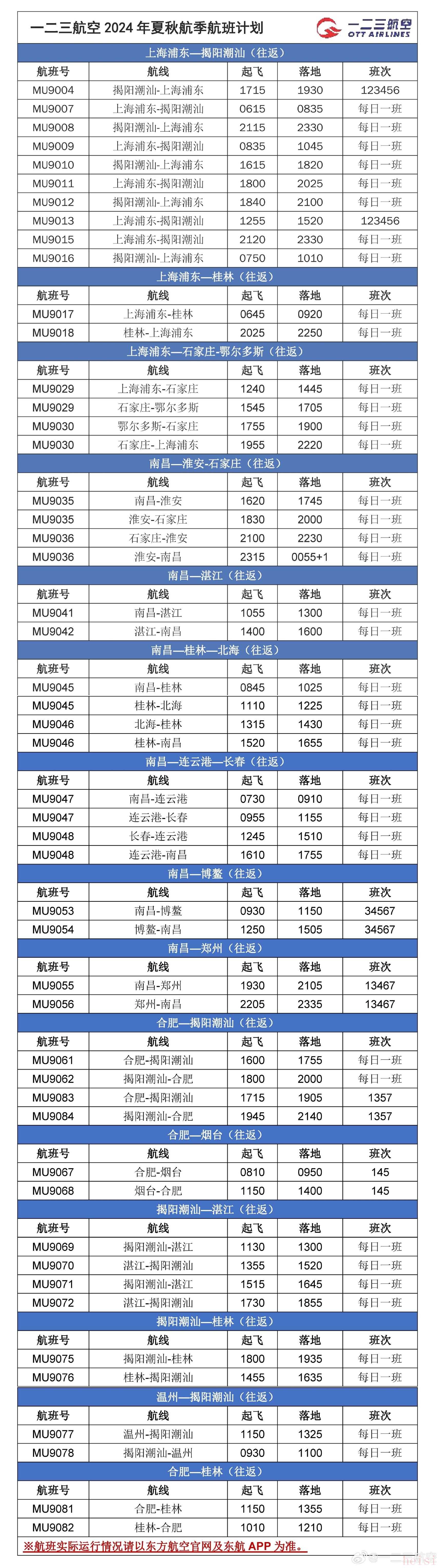 一二三航空2024夏秋航季共計劃執(zhí)飛15條航線,通達上海、南昌、合肥、揭陽潮汕、桂林、石家莊、鄂爾多斯、淮安、北海、連云港、長春、溫州、博鰲、鄭州、湛江、煙臺16座城市。
