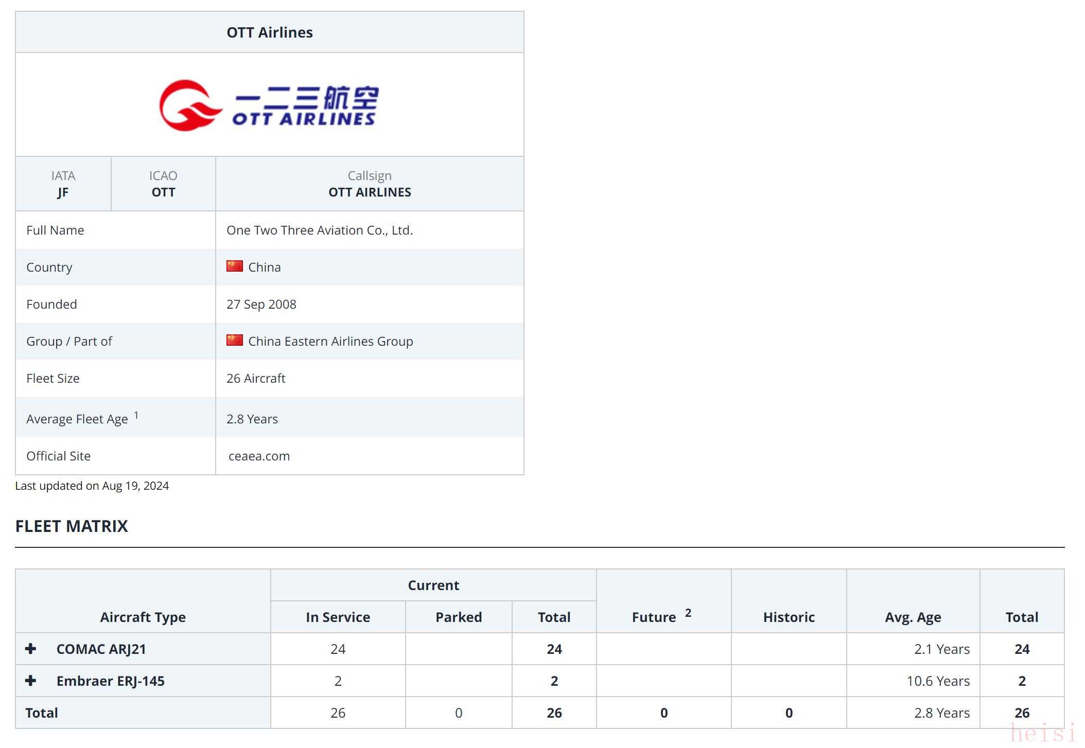 一二三航空主要運營ARJ21國產(chǎn)支線客機,其ARJ21機隊規(guī)模從2020年3架、2021年7架、2022年和2023年17架發(fā)展到2024年中24架,以及兩架機齡超過十年的從東航公務(wù)航空轉(zhuǎn)移來的巴航工業(yè)ERJ135(Legacy650)。