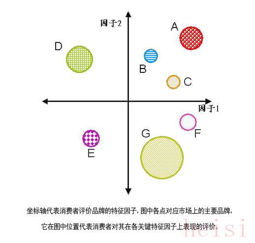 其次,展開數(shù)據(jù)資料的調(diào)查收集,即確定各品牌在知覺圖上的位置。常借助統(tǒng)計(jì)軟件包(如SPSS) 輔助工作, 把消費(fèi)者對各品牌在關(guān)鍵特征因子上的表現(xiàn)評價(jià)量化。對應(yīng)分析程序,可將消費(fèi)者對各品牌在評價(jià)因子上的數(shù)據(jù)轉(zhuǎn)化為知覺圖(見下圖)。利用多維尺度也能得出類似的圖形。