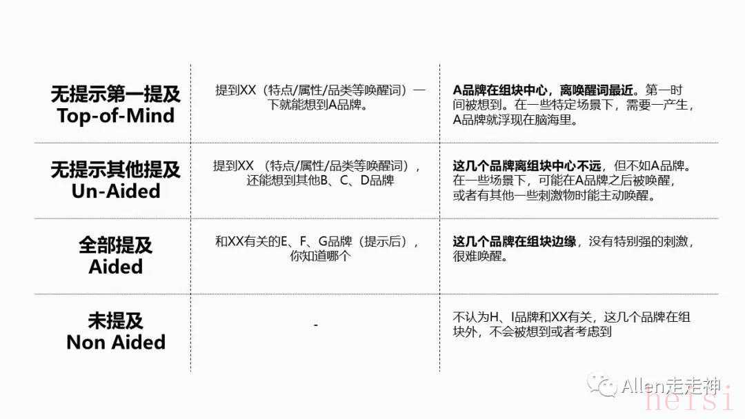 從這個角度看,衡量品牌知名度的三個指標(biāo)里,也分別暗示了品牌在記憶中的“位置”。