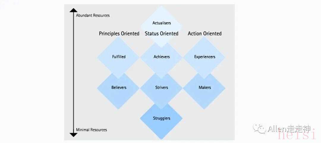 VALS2主要適合早年的北美市場,時過境遷一些人群的分類可能也有變化,不過依然很具有參考價值。具體來講,將消費市場細(xì)分成了8種不同的生活觀和價值觀集合。