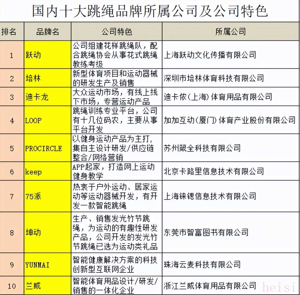 排名第一的是躍動(dòng),他屬上海躍動(dòng)文化傳播有限公司的品牌,是國(guó)內(nèi)品牌,公司特色是有組建自己花樣跳繩隊(duì),配合跳繩協(xié)會(huì)從事花式跳繩教練考級(jí),其躍動(dòng)牌跳繩都是委外生產(chǎn)。