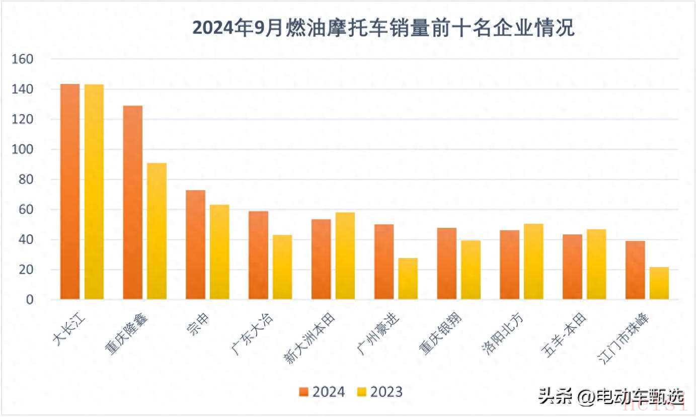 根據(jù)摩托車商會(huì)統(tǒng)計(jì),2024年1-9月燃油摩托車產(chǎn)1229.12萬(wàn)輛、銷11227.11萬(wàn)輛。銷量前十名的品牌分別是:大長(zhǎng)江、隆鑫、宗申、廣東大冶、新大洲本田、廣州豪進(jìn)、重慶銀翔、洛陽(yáng)北方、五羊-本田、江門市珠峰。