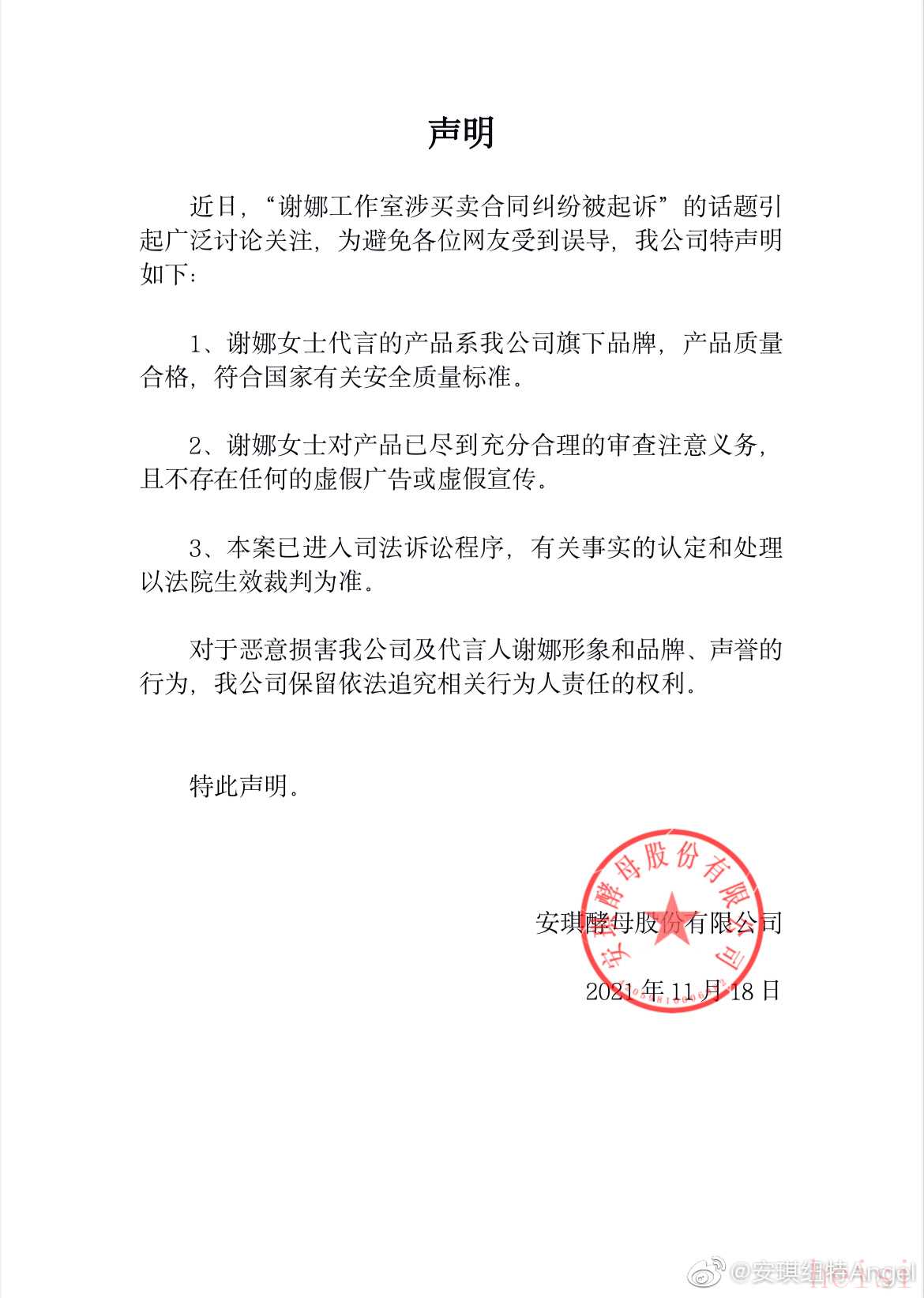 聲明還稱,對(duì)于惡意損害公司及代言人謝娜形象和品牌、聲譽(yù)的行為,公司保留依法追究相關(guān)行為人責(zé)任的權(quán)利。