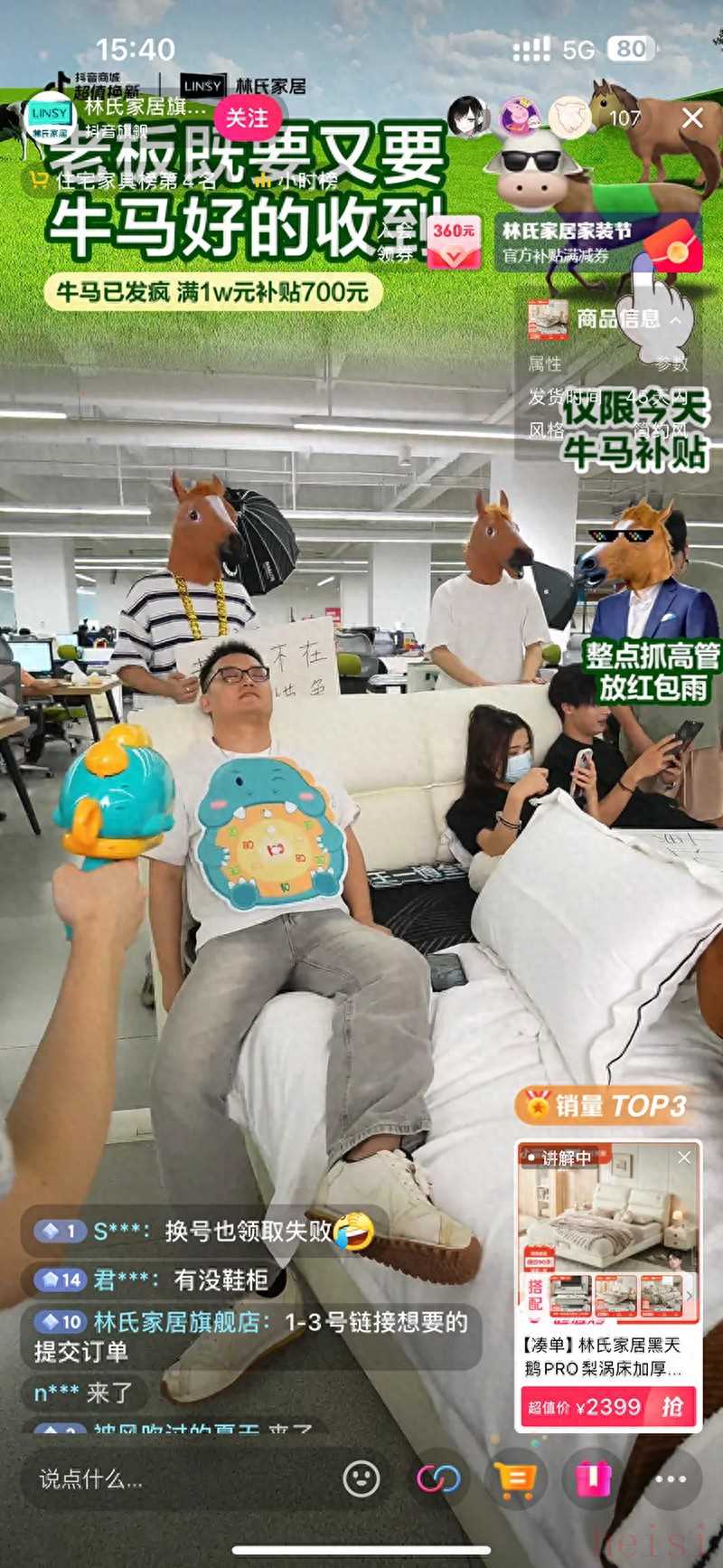 “牛馬”一詞一直是年輕人的自嘲,形容打工者的上班狀態(tài)。林氏家居將這一松弛狀態(tài)呈現(xiàn)在直播間里,在辦公室內(nèi),林氏員工是正在工作的牛馬,帶貨人是帶著牛馬面具的主播,打造出“今天老板不在,大家自助下單”的輕松氛圍感。這波反向營銷,迅速引發(fā)共鳴,圈住了年輕人對林氏家居的好感度,進(jìn)而順利促單。
