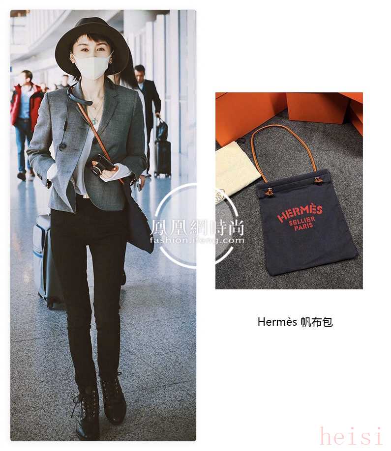 Hermès的帆布包并不多,王子文用灰色短西服、黑色長褲搭配了一只斜背的藏青色Hermès帆布包,這身文藝風(fēng)格的搭配,精致有型。