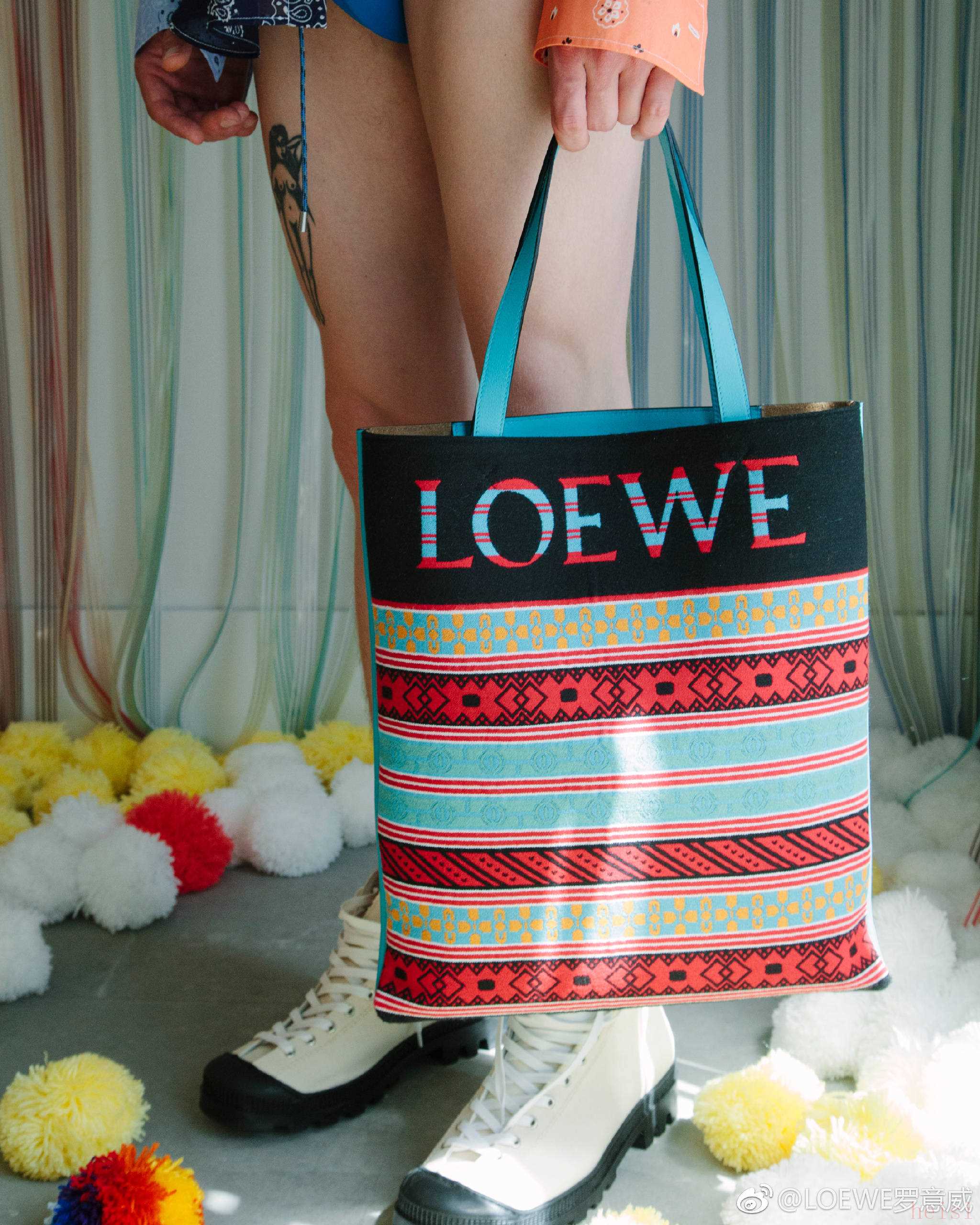 Loewe推出的一款帆布斜挎包,包上縫制有品牌標(biāo)志性的皮革飾片,商標(biāo)則以版畫和刺繡的方式呈現(xiàn)。整個包的配色非常靚麗,很適合夏天。