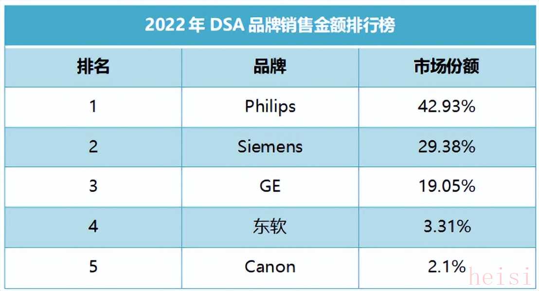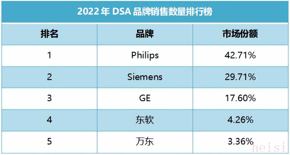在DSA的市場(chǎng)銷售數(shù)據(jù)方面,依舊沿襲了傳統(tǒng)的GPS(GE、Philips、Siemens)霸榜統(tǒng)治局面。其中飛利浦以42.71%的市場(chǎng)份額穩(wěn)居榜首,其次是西門子以29.71%占據(jù)榜二,GE以17.60%位居第三。