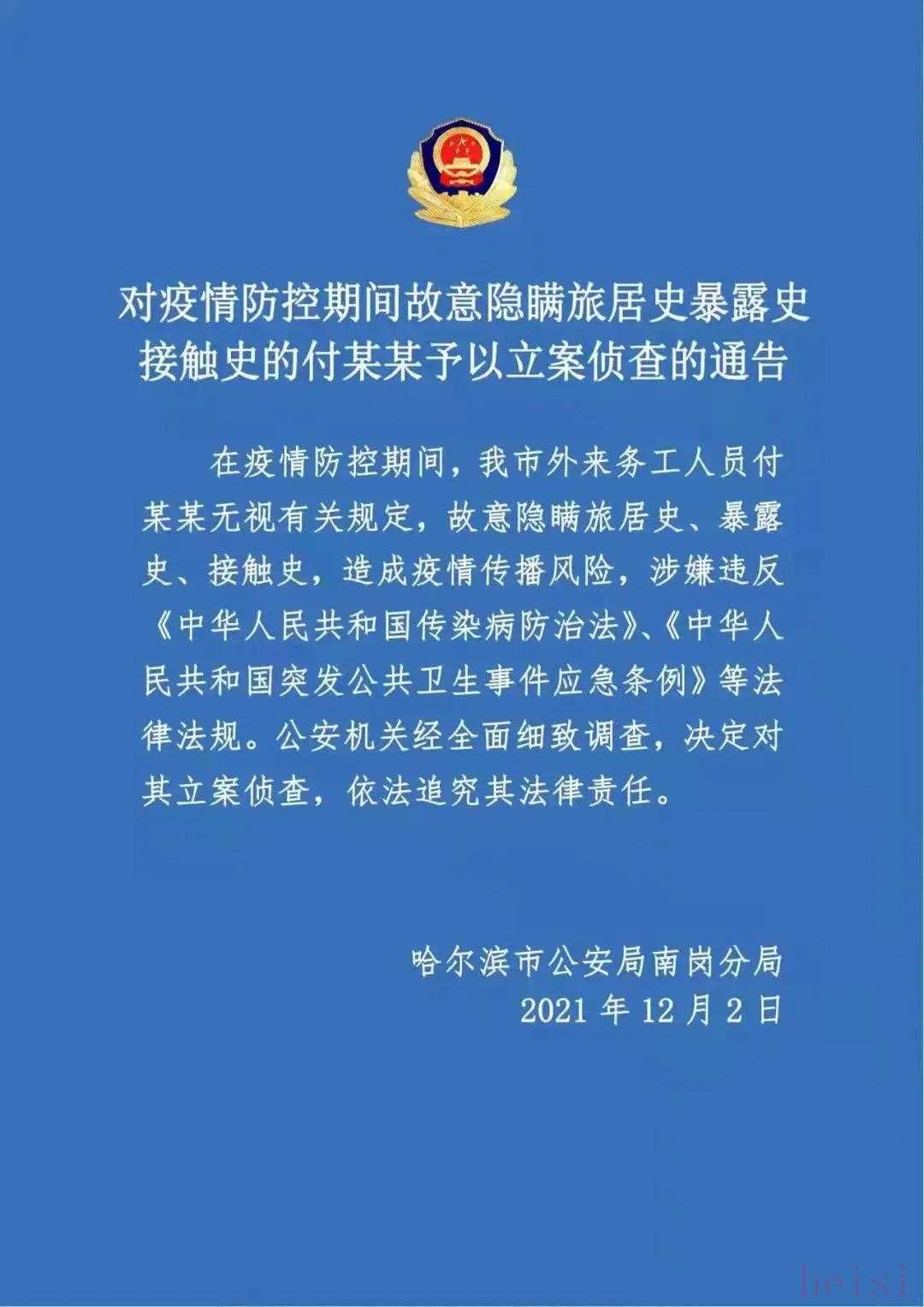 12月2日,記者從哈爾濱市公安局南崗分局了解到,在最近疫情防控期間,哈爾濱市外來務工人員付某某無視有關規(guī)定,故意隱瞞旅居史、暴露史、接觸史,造成疫情傳播風險,涉嫌違反《中華人民共和國傳染病防治法》、《中華人民共和國突發(fā)公共衛(wèi)生事件應急條例》等法律法規(guī)。公安機關經(jīng)全面細致調(diào)查,決定對其立案偵查,依法追究其法律責任。