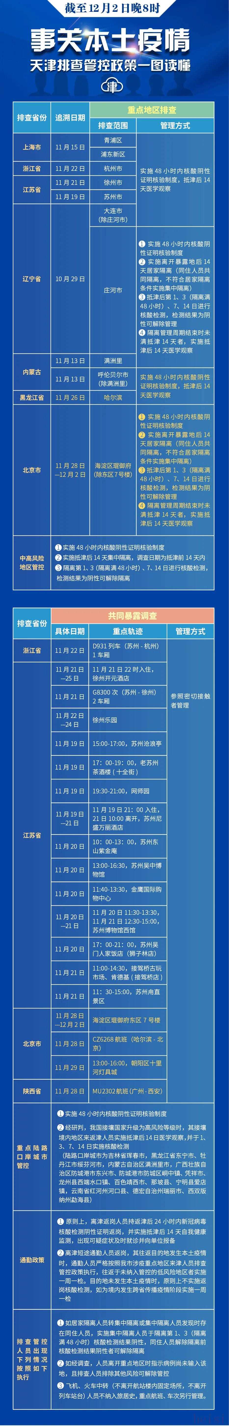 二、經(jīng)過流行病學調(diào)查后,涉及下述流行病學史:11月28日至12月2日途經(jīng)北京市琨御府東區(qū)7號樓;11月28日乘坐CZ6268航班(哈爾濱-北京);11月29日13時至16時途經(jīng)朝陽區(qū)十里河燈具城;11月28日乘坐MU2302航班(廣州-西安),均為新增感染者軌跡重合人員,參照密切接觸者管理,集中隔離管理周期結(jié)束時未滿抵津14天者,繼續(xù)實施居家隔離至抵津后14天。