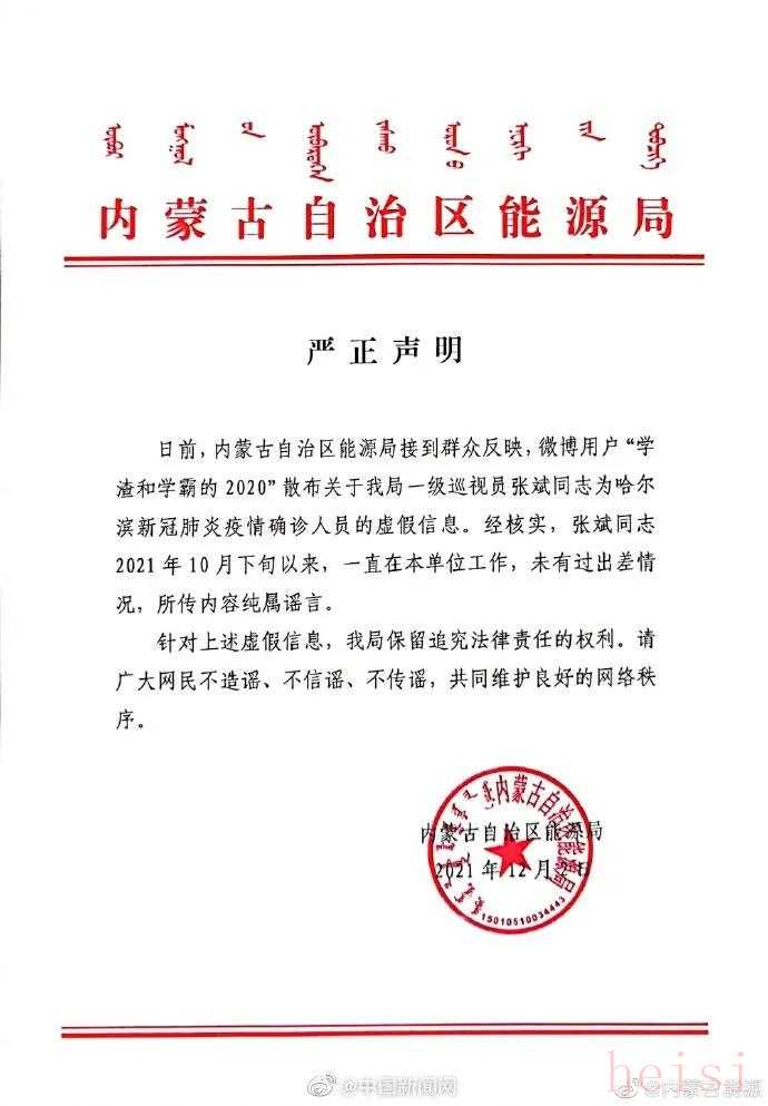 據(jù)@內(nèi)蒙古能源 :日前,有微博用戶散布關于我局一級巡視員張斌同志為哈爾濱新冠肺炎疫情確診人員的虛假信息。經(jīng)核實,張斌同志2021年10月下旬以來,一直在本單位工作,未有過出差情況,所傳內(nèi)容純屬謠言。