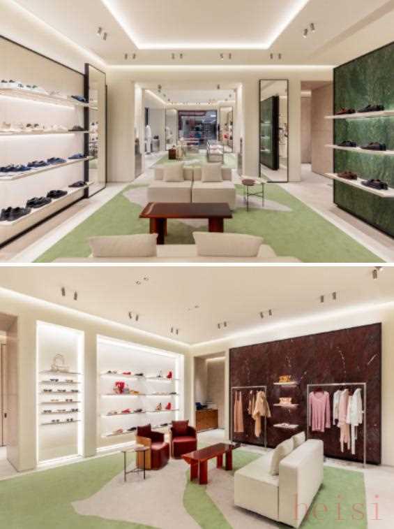 精品店頌揚意大利近百年間的卓越匠藝,禮贊工藝創(chuàng)新、高超設(shè)計與驚艷巧思;致敬品牌對鞋履匠造的不渝熱情,綻煥奢華隨性格調(diào),彰顯悠久傳承的經(jīng)典魅力。室內(nèi)設(shè)計滿蘊現(xiàn)代摩登情懷,締造隨時代更迭演進的雅致風(fēng)尚,這與Ferragamo品牌調(diào)性相得益彰,亦與品牌創(chuàng)意總監(jiān)Maximilian Davis的理念不謀而合。