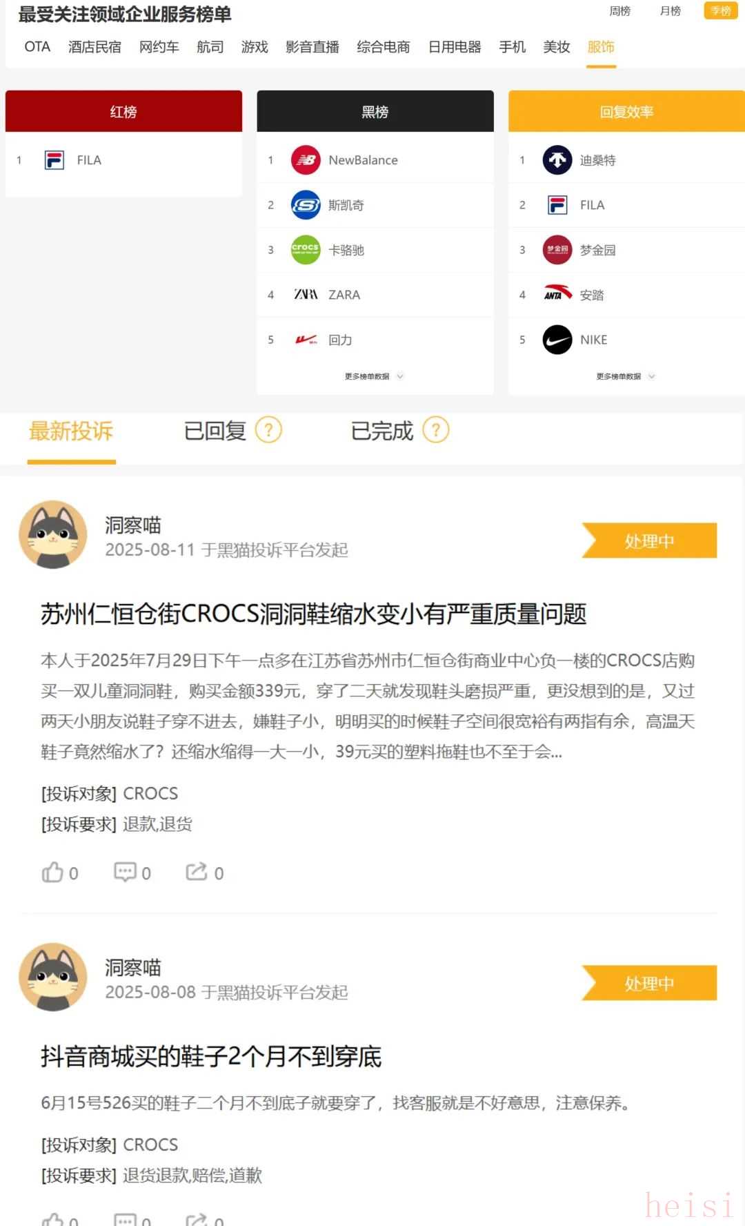 Crocs“鯨魚系列”部分鞋型營銷的本質(zhì)是價值放大器,而非價值替代品。一旦品牌對營銷的重視高過用戶的真實需求,再密集的投入也只會變成“打水漂”。在營銷狂歡的另一面,以Crocs為首的洞洞鞋正陷入一場信任危機(jī)。黑貓平臺2025年Q2鞋類投訴榜中,Crocs因縮水、開膠、鞋花脫落等問題位列第三。Crocs看似“踩屎感”的柔軟設(shè)計,實則也埋下了隱患。一是鞋底缺乏支撐性,長期穿著會導(dǎo)致足底筋膜慢性勞損,甚至誘發(fā)不可逆的足弓塌陷;二是寬大鞋頭與電梯臺階的“致命距離”,讓洞洞鞋成為全球扶梯事故的一大“元兇”。當(dāng)品牌在小紅書宣揚(yáng)“洞門永存”的態(tài)度時,消費(fèi)者卻有可能正在戶外高溫天氣下遭遇“鞋底融化”的尷尬。這種“營銷吹上天,產(chǎn)品掉鏈子”的反差,正在動搖消費(fèi)者對品牌的信任根基。