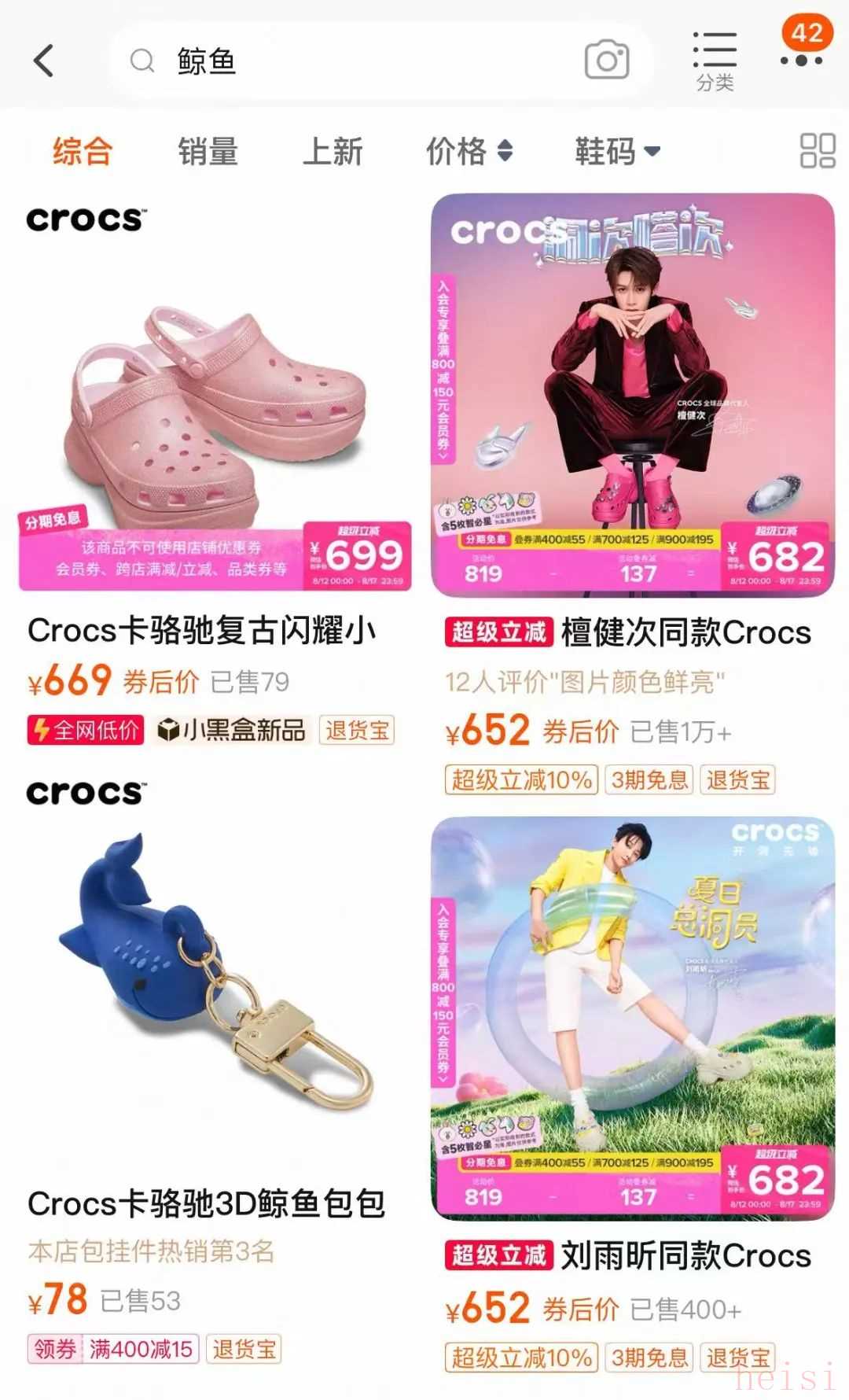 Crocs在淘寶旗艦店售賣中的部分鞋花(智必星)每一雙經(jīng)過精心設(shè)計的Crocs,都變成了展示個人風(fēng)格的移動畫板,承載著主人的故事和態(tài)度。這種深度的參與感,讓用戶黏性大增,也讓Crocs在Z世代心中扎下了根。小紅書和抖音上,“洞門”相關(guān)標(biāo)簽的討論量早已突破驚人的6.7億次,形成了一股自下而上的強(qiáng)大潮流。它契合了年輕人對過度精致生活的厭倦,穿上洞洞鞋去上班,帶著點“不按常理出牌”的小小叛逆。當(dāng)然,這一文化現(xiàn)象的興起并非偶然,背后是Crocs對中國市場持續(xù)的資源傾斜和戰(zhàn)略投入。在社交媒體上,Crocs倚重易夢玲、白晝小熊這類兼具顏值和時尚感的腰部博主,他們用穿搭示范,成功將洞洞鞋塑造成了百搭的時尚單品。同時,簽約劉雨昕、檀健次、白鹿三位風(fēng)格迥異的代言人,成功將品牌送達(dá)不同圈層。中國市場當(dāng)前的繁榮,更像是踩著北美的老路反向狂奔過去——用更密集的營銷、更狠的折扣、更熱鬧的社群文化,暫時穩(wěn)住了增長。塑料鞋的明天只有營銷在線可不行當(dāng)北美因縮減營銷陷入增長停滯時,中國團(tuán)隊正把這套“重金押注營銷”的策略推演到極致。但這繁榮里也藏著暗礁。淘寶官旗店熱銷榜TOP5中,Crocs三款低價基礎(chǔ)鞋銷量單款均超10萬雙,而600元以上的“鯨魚系列”全加起來可能也不過萬余雙。這像在提醒,直到現(xiàn)在,消費(fèi)者仍不認(rèn)可Crocs這個品牌具有高價值。