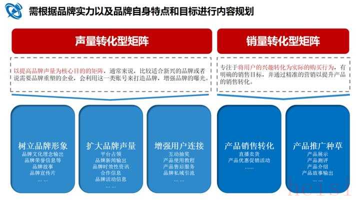 內(nèi)容規(guī)劃需根據(jù)矩陣類型與賬號定位差異化設(shè)計(jì)。聲量轉(zhuǎn)化型矩陣側(cè)重品牌曝光,內(nèi)容包括品牌故事、文化理念、榮譽(yù)信息、時(shí)效性資訊、活動動態(tài)等,適合新興品牌或需重塑的品牌;銷量轉(zhuǎn)化型矩陣聚焦購買行為引導(dǎo),內(nèi)容涵蓋產(chǎn)品展示、測評、創(chuàng)新用法、優(yōu)惠活動、直播賣貨等,直接服務(wù)銷售目標(biāo)。