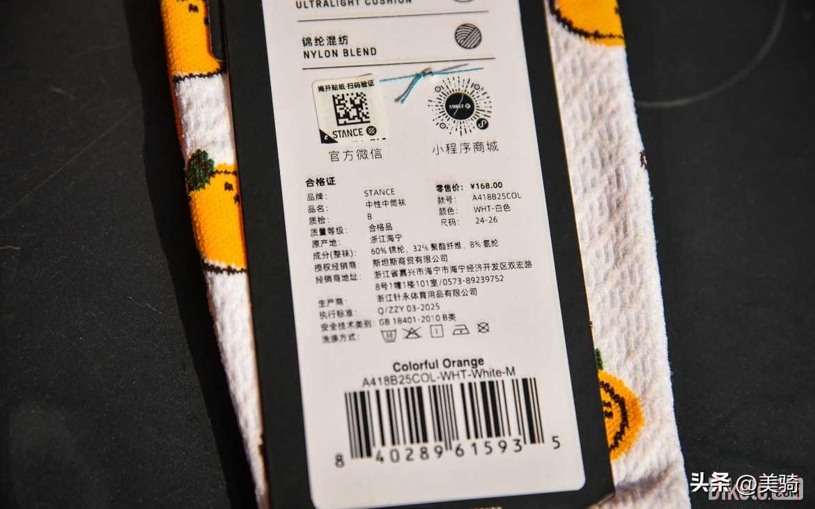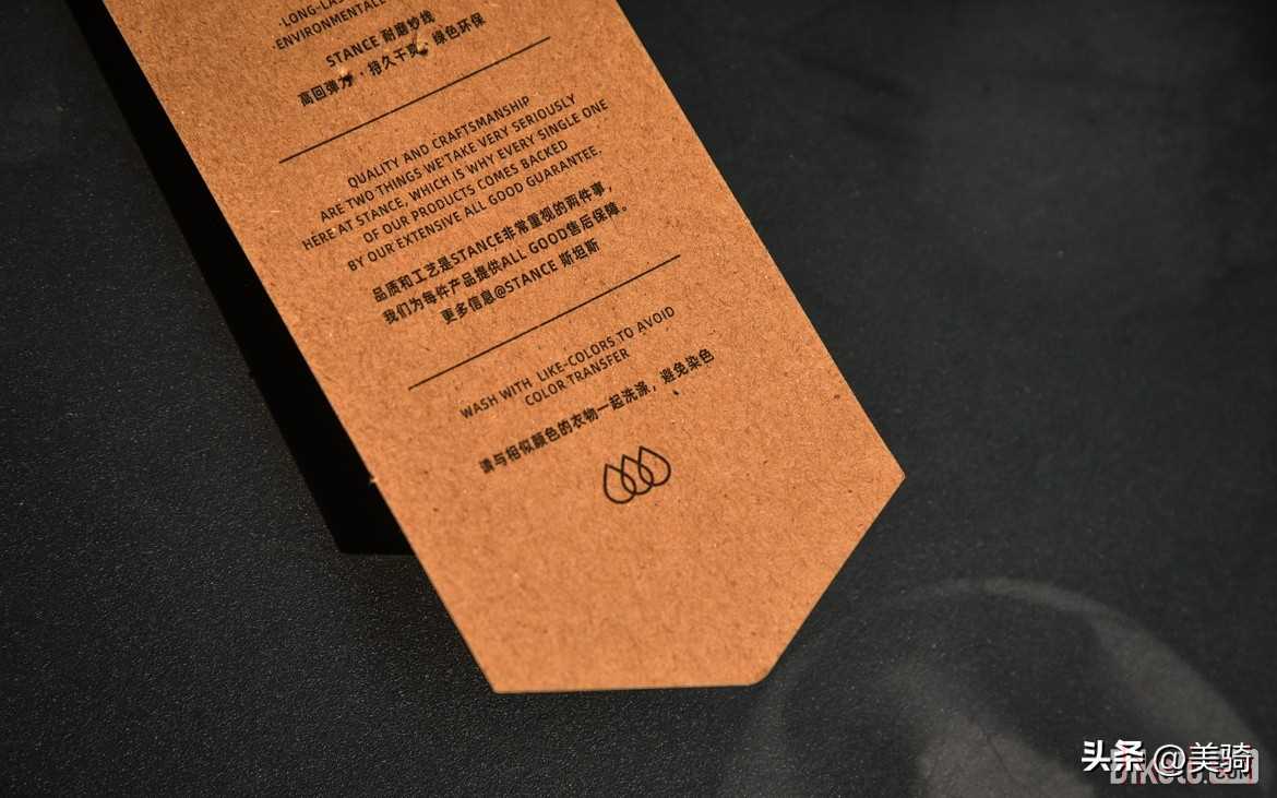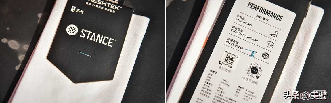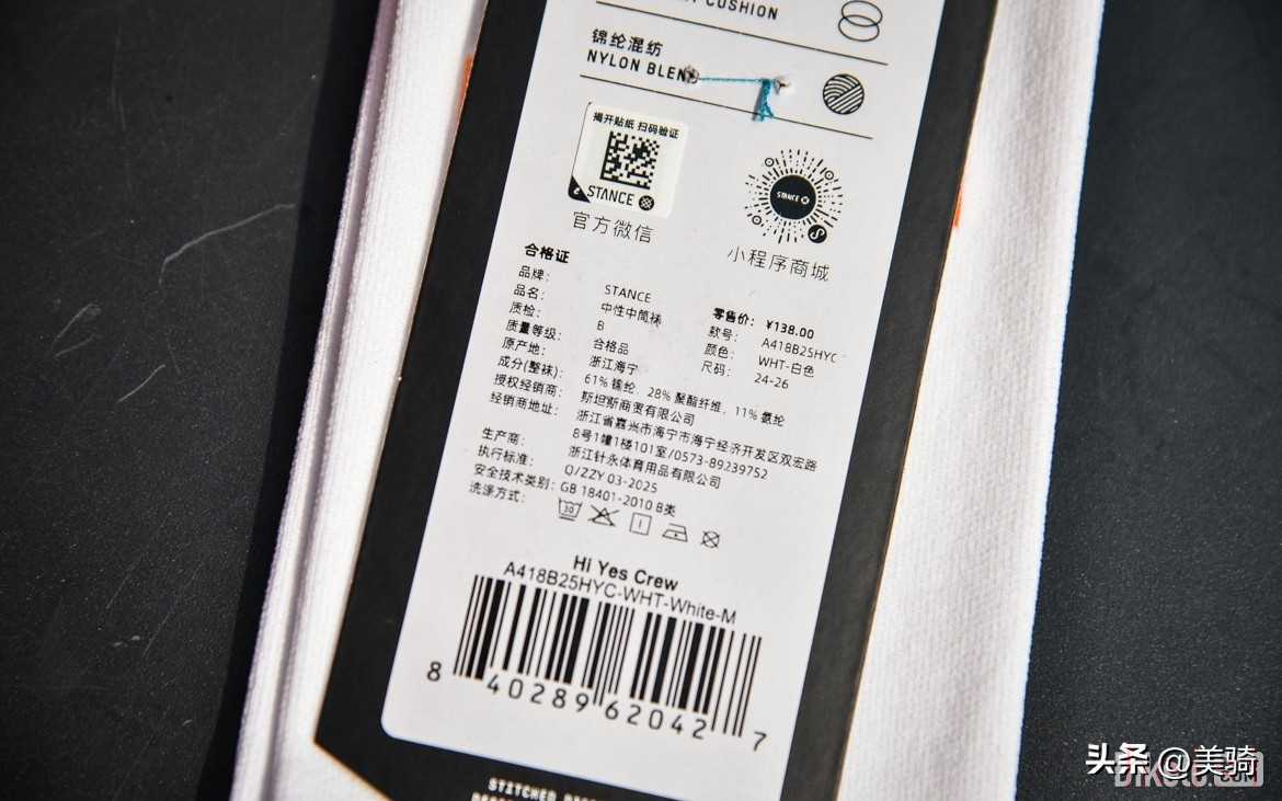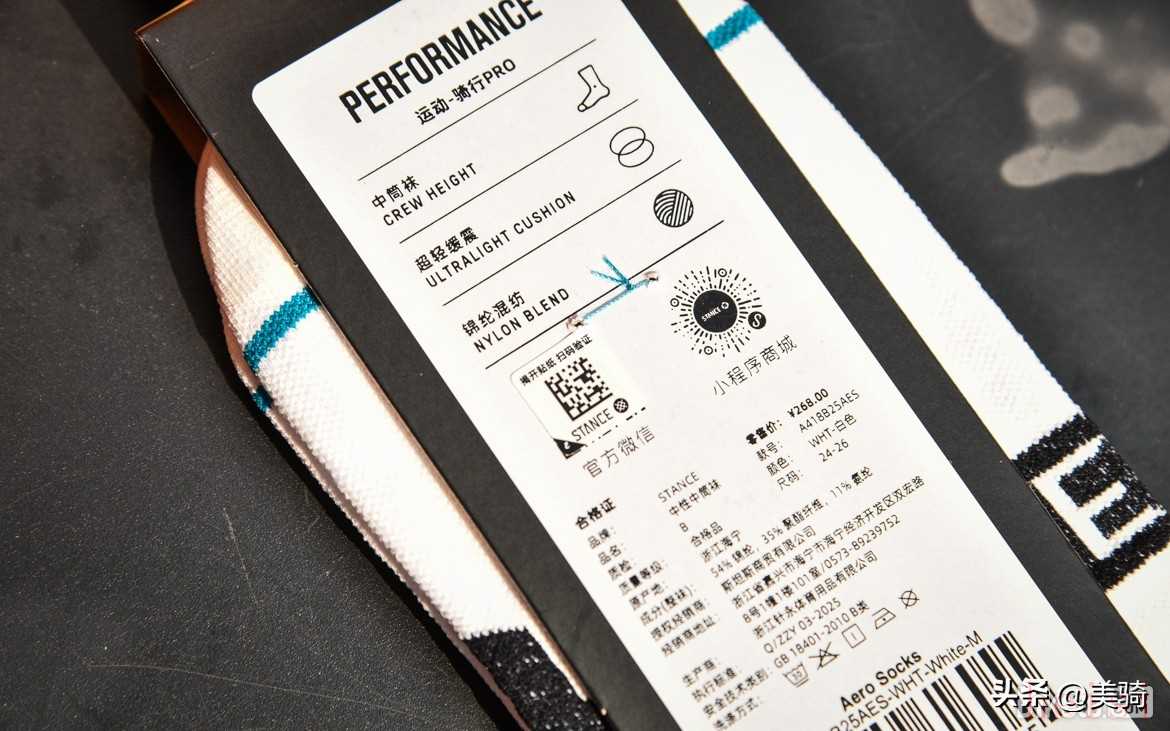 下面就來單獨(dú)看看三款襪子,首先我們先來看看最便宜的“專業(yè)騎行襪”。首先是吊卡背面的產(chǎn)品屬性,可見入門級的襪子都要138元,在騎行襪中定位還是比較高的。生產(chǎn)商浙江針永據(jù)說是持有STANCE的股份之類的,所以STANCE的襪子都在位于海寧的自有智慧工廠生產(chǎn),以確保品質(zhì)。