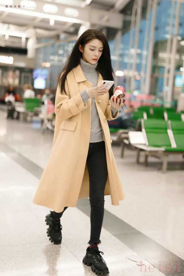 傅菁在機(jī)場時還穿了一件淡黃色的呢大衣搭配黑色運動鞋,相比上一件的端正大氣,這件更清新減齡,很適合日常穿搭參考。