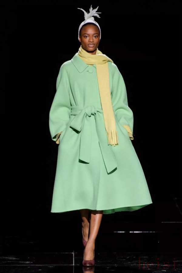 杏色的系帶大衣搭配出挑的綠色包包及長襪,配色別致,慵懶輕松,簡單又有趣。