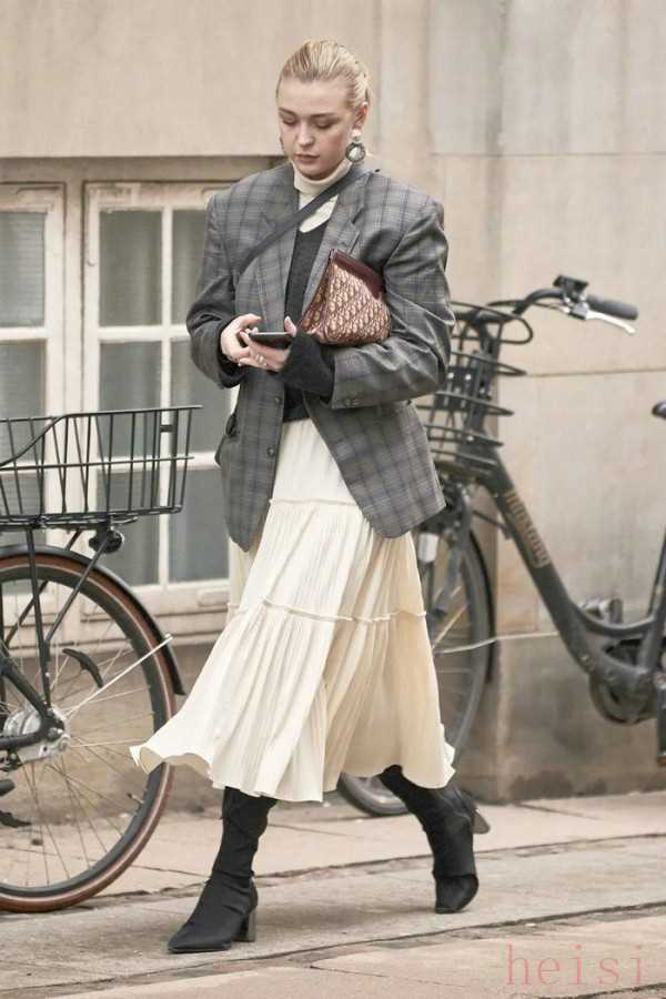 oversisz的廓形大衣是凹造型的最佳利器,酷感十足的格紋的廓形大衣搭配一條飄逸的半裙,酷與柔的結(jié)合,盡量選擇偏短的大衣款式,更能體現(xiàn)最佳身材比例。