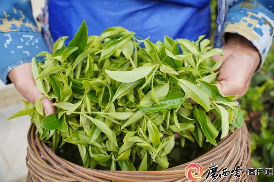 在昭平縣一個(gè)有機(jī)茶種植基地里,茶農(nóng)向記者展示新鮮采收的谷雨茶。鄒信升 攝