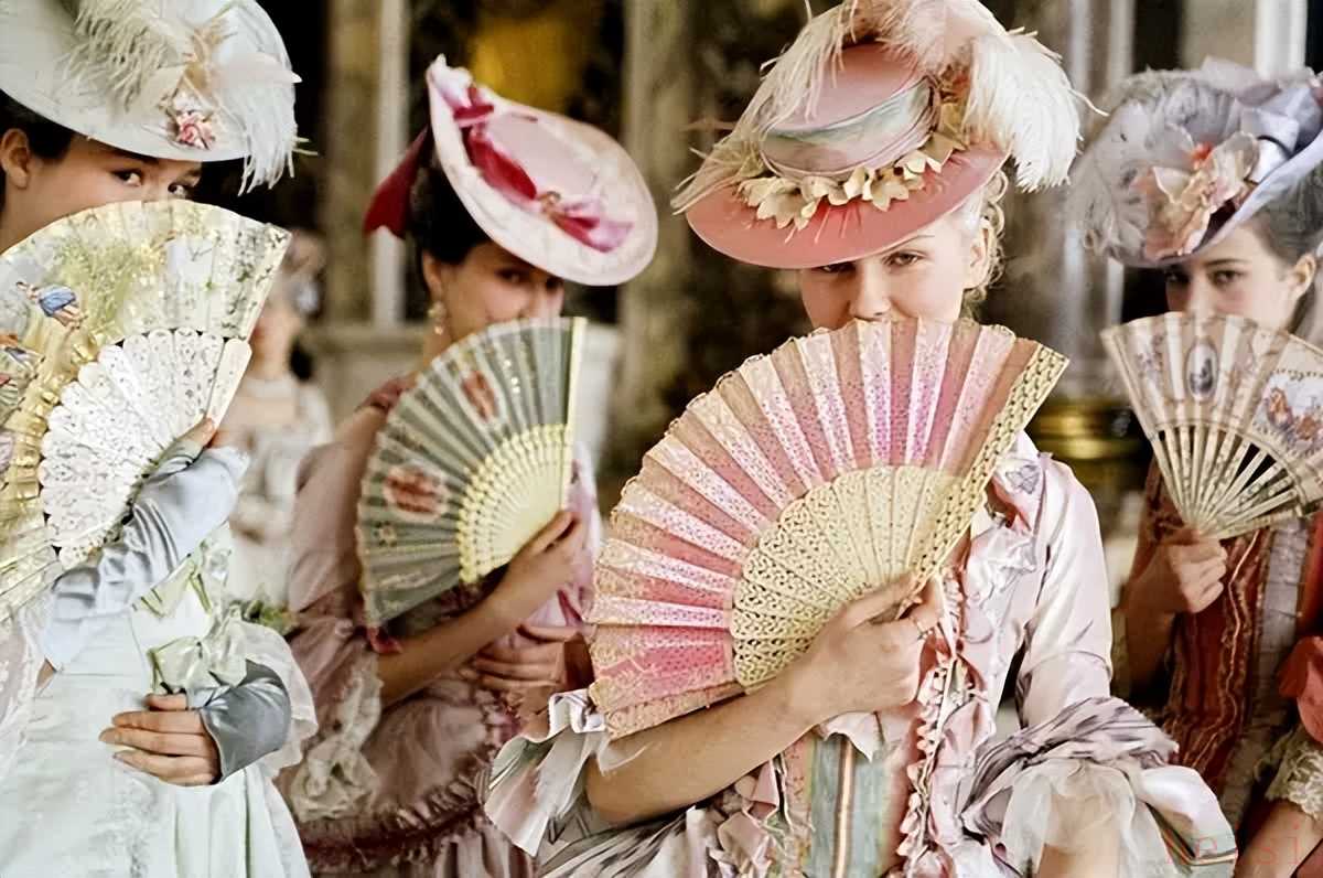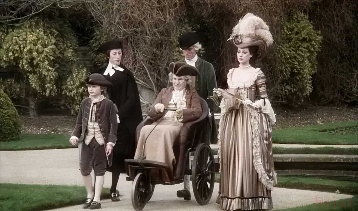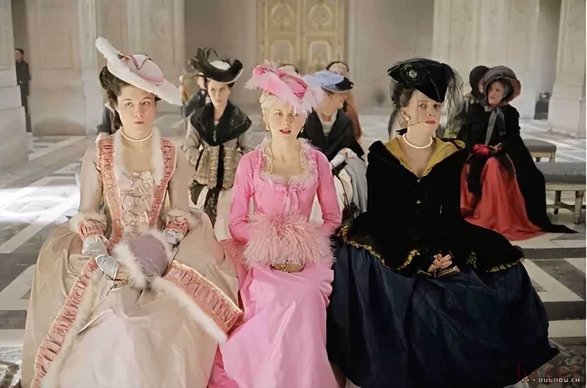 在相同的時代服裝廓形下,細(xì)節(jié)上的對比也成為了塑造人物矛盾的重要手段。《巴里·林登》中與林登夫人的素色裙裝相對比的是巴里·林登鮮艷的天鵝絨套裝,并且采用了“世界上能織出的最好的天鵝絨”,從而表現(xiàn)他成為貴族后地位的上升;與瑪麗皇后相對的則是她公公的情婦,她的裙裝大多為深藍(lán)色,在一群衣著粉嫩的少女間顯得格外乍眼。