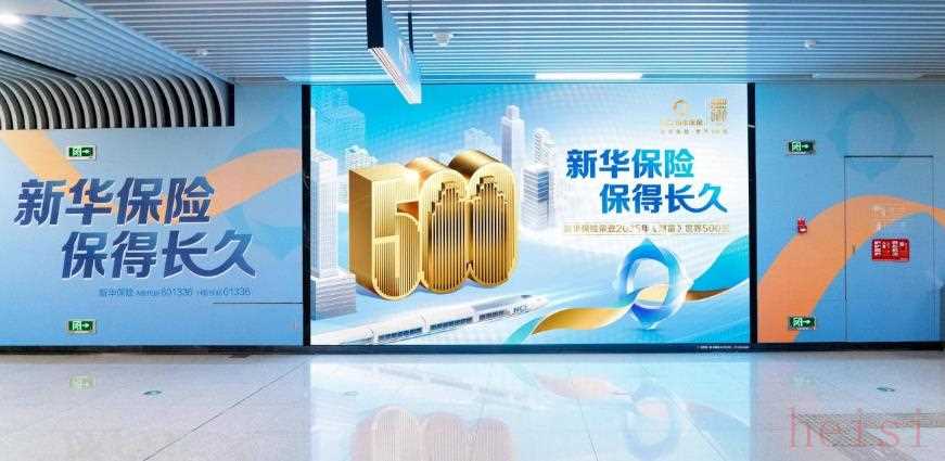 天鵝湖站是合肥特色主題站點之一,品牌廣告以“新華保險 保得長久”“好產(chǎn)品在新華”“好服務在新華”“好人生在新華”為核心視覺語言,將保險的守護寓意與天鵝湖站“自然和諧”的設計主題巧妙融合。車站付費區(qū)采用了較大面積的拱頂設計,流線型吊頂貼合天鵝優(yōu)雅的姿態(tài)和天鵝湖水波的靈動,水藍色的玻璃壁畫與新華保險品牌墻面融為一體,相得益彰,體現(xiàn)“開放包容”的品牌價值觀。位于站廳核心位置的LED屏震撼展示榮登《財富》世界500強海報資訊,傳遞“保得長久”的品牌承諾。