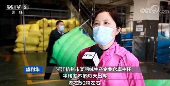 在浙江省杭州市蕭山區(qū)一家生產(chǎn)羽絨的工廠成品倉庫,十幾輛卡車正在準備裝貨,倉庫的負責人告訴記者,這家工廠現(xiàn)在每天出庫的成品羽絨超過50噸,現(xiàn)在是他們最繁忙的時候。