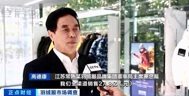 江蘇常熟某羽絨服品牌集團董事局主席兼總裁 高德康:雙十一期間,我們?nèi)冷N售27.8億元,相比去年有超過50%的增長,按照目前的市場和天氣的情況預測,預計今年我們整體的銷售情況會有比較樂觀的增長。