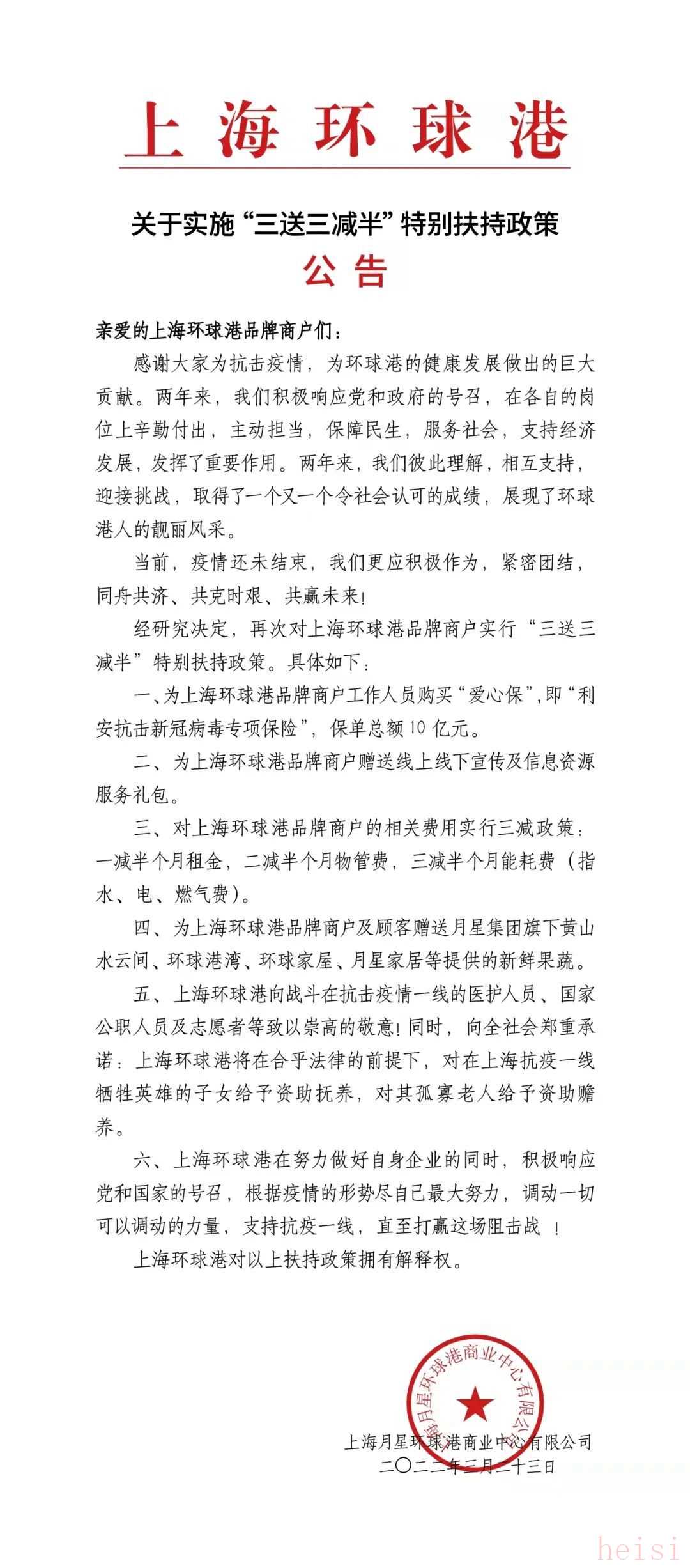 今天,國(guó)內(nèi)大型實(shí)體商業(yè)企業(yè)月星集團(tuán)旗下兩大旗艦城市綜合體——上海環(huán)球港和常州江南環(huán)球港雙雙發(fā)布公告,宣布出臺(tái)扶持政策,對(duì)商戶實(shí)行專項(xiàng)幫扶。除了企業(yè)亟需的“三減半”政策之外,月星集團(tuán)還推出了“三送”舉措:為兩家環(huán)球港品牌商戶工作人員購(gòu)送“抗擊新冠病毒專項(xiàng)保險(xiǎn)”,保單總額合計(jì)20億元;為品牌商戶贈(zèng)送線上線下宣傳及信息資源服務(wù)禮包;為品牌商戶及顧客贈(zèng)送月星集團(tuán)旗下黃山水云間、環(huán)球港灣、環(huán)球家屋、月星家居等提供的新鮮果蔬。