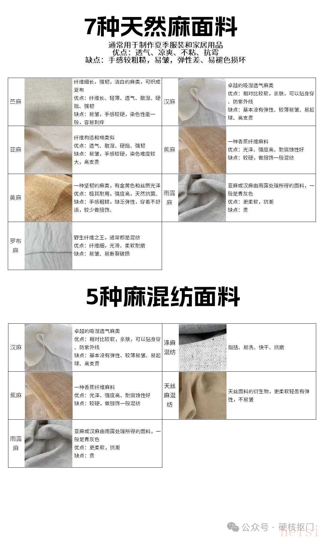 天然麻面料和混紡參考這張,選麻的時候最好買厚一點的,不然很容易皺,縮水變形。