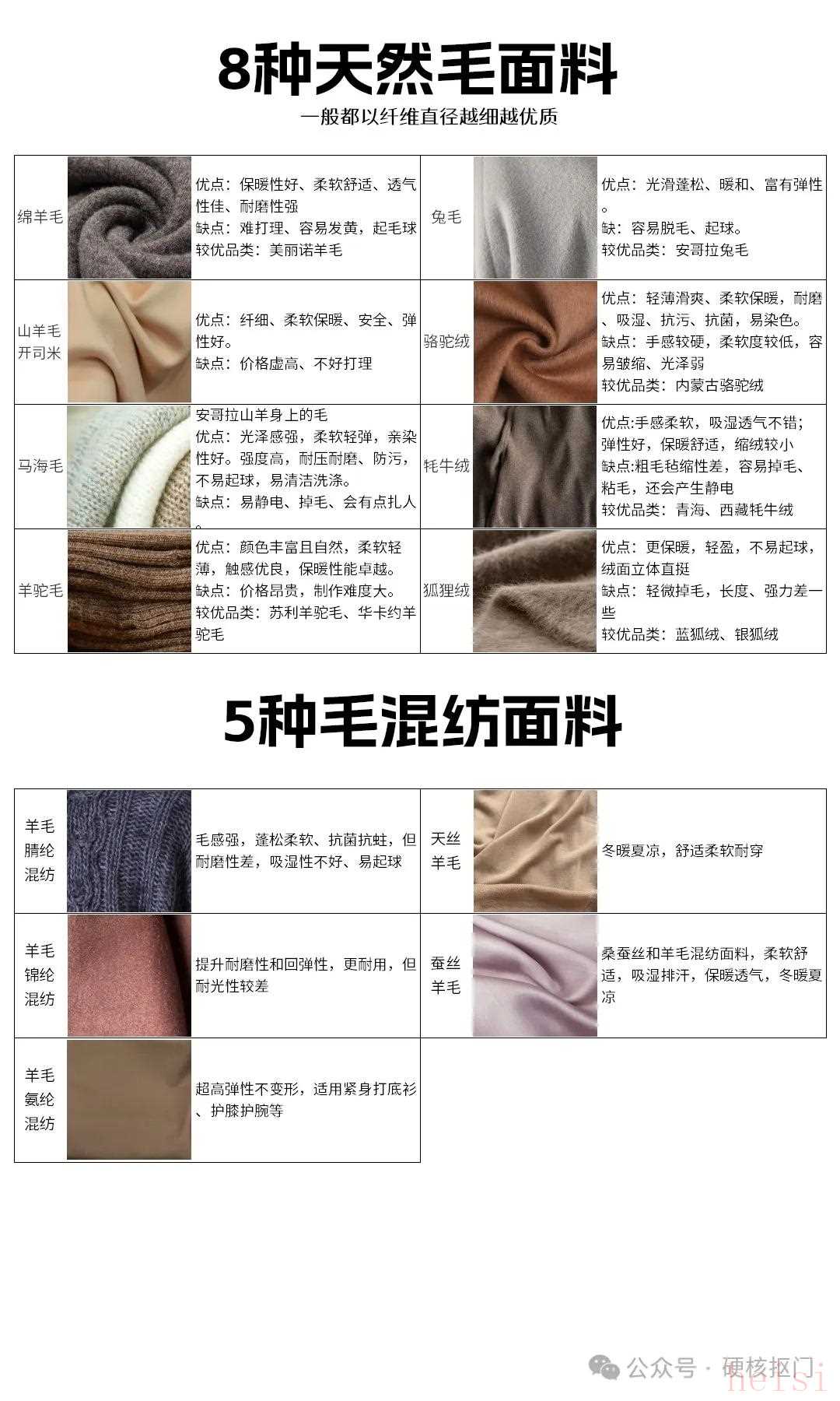 天然毛面料和毛混紡參考這張,毛幾乎和所有面料都能混紡,除了提到的這些還有很多