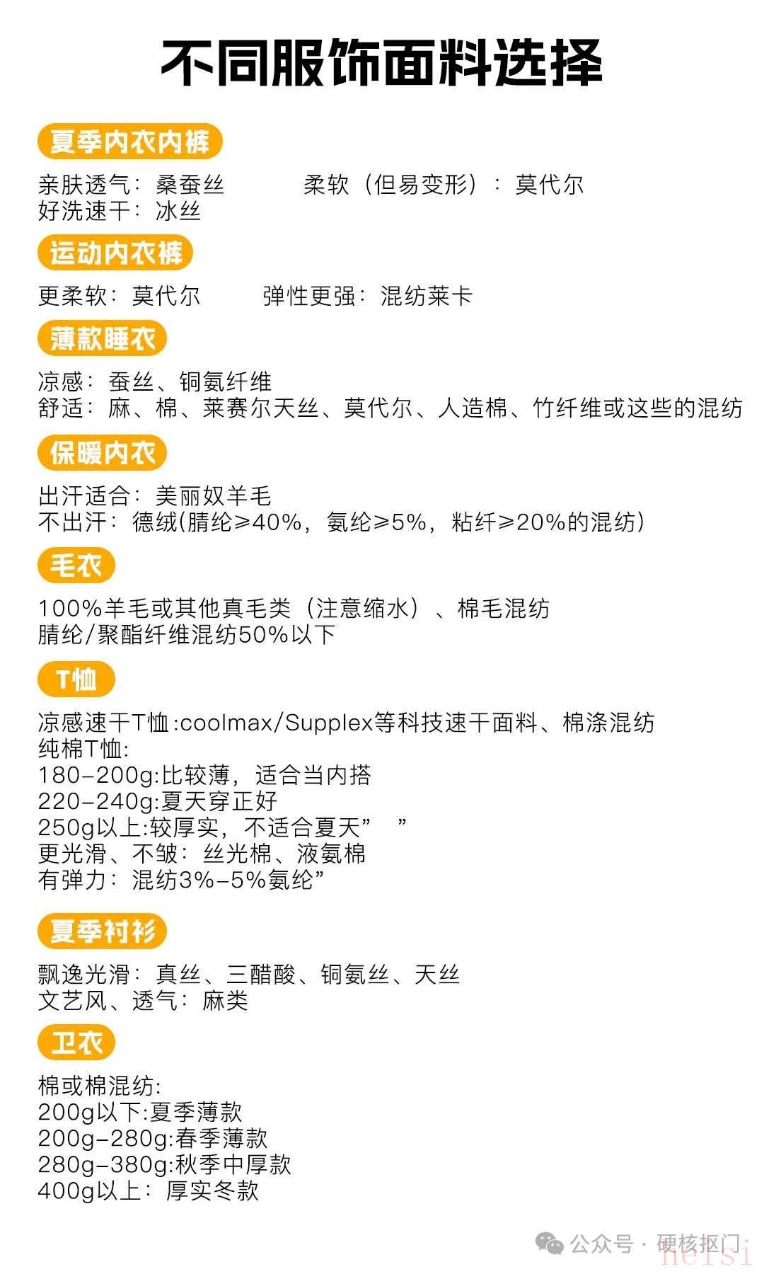 最后,直接快速簡單的買衣服技巧,不同服飾怎么選面料參考這張~