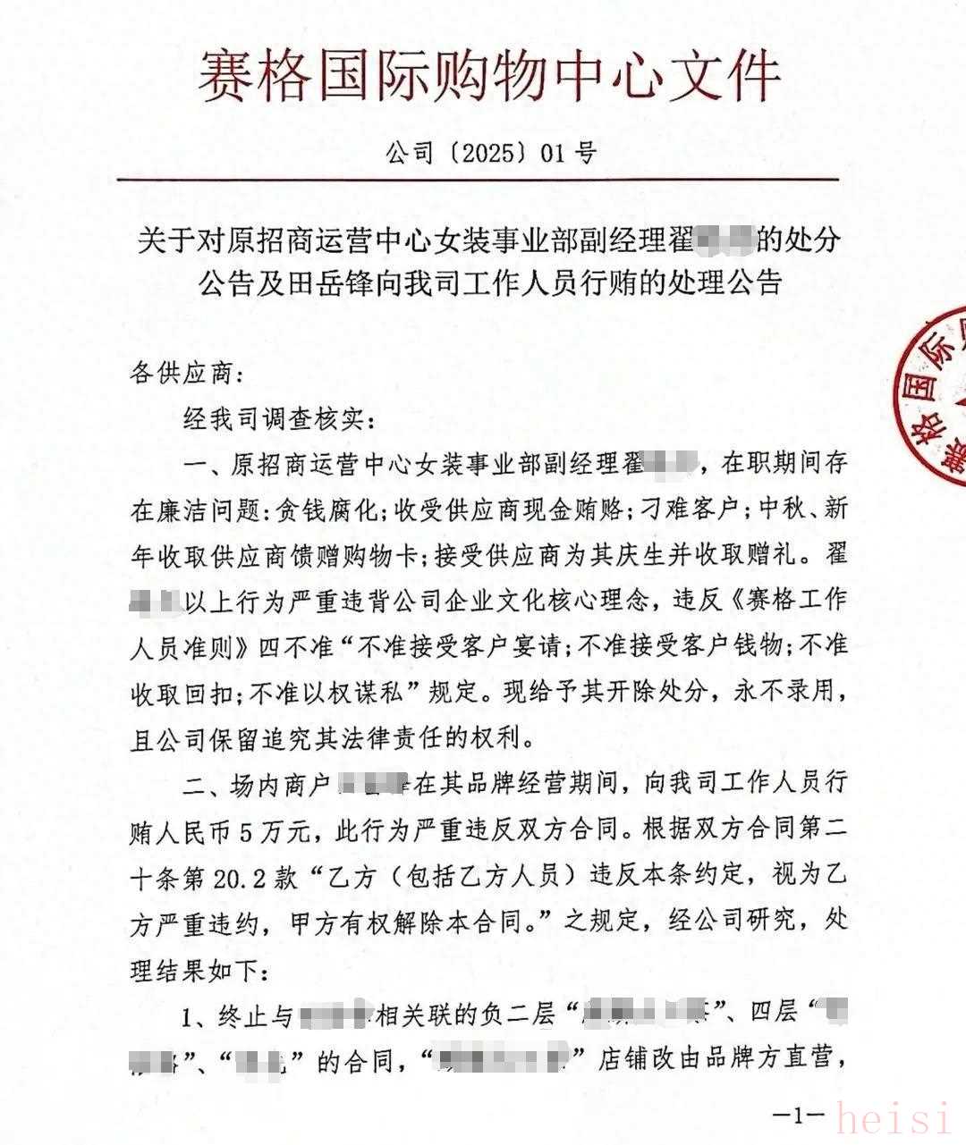除此之外,場內(nèi)商戶田某某在其品牌經(jīng)營期間,向公司工作人員行賄人民幣5萬元,此行為嚴(yán)重違反雙方合同。根據(jù)雙方合同相關(guān)規(guī)定,與田某某相關(guān)聯(lián)的負(fù)二層“??茶”、四層“???”“??”的合同,“??茶”店鋪改由品牌方直營,“???”“??”于2025年7月31日進(jìn)行撤柜清場。田某某被納入供應(yīng)商黑名單,永不合作。