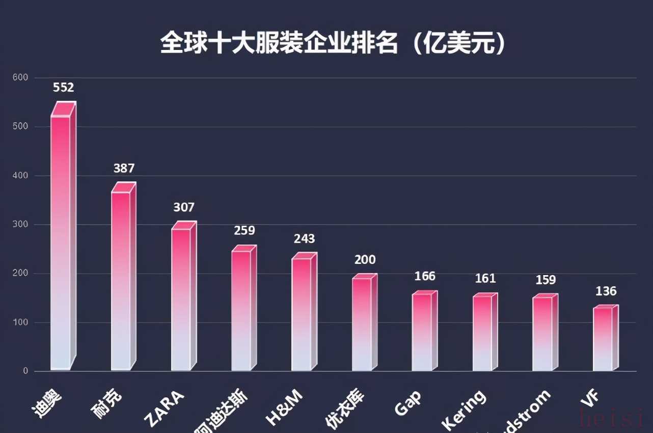 阿迪達(dá)斯排在服裝企業(yè)榜單第四,年收入約259億美元。品牌1949年創(chuàng)辦于德國(guó),產(chǎn)品包括有球類和田徑運(yùn)動(dòng)服飾、運(yùn)動(dòng)鞋、瑜伽服飾、休閑鞋類等;第三名是西班牙的ZARA,年銷售額約307億美元,通過(guò)以強(qiáng)有力的線下產(chǎn)業(yè)支撐、有效的全程數(shù)據(jù)采集和品控、快速的市場(chǎng)反應(yīng),為消費(fèi)者提供更有競(jìng)爭(zhēng)力的產(chǎn)品。如今已成為全球最大的快時(shí)尚品牌之一。排在全球服裝企業(yè)榜第二的是耐克,企業(yè)營(yíng)收達(dá)387億美元。公司生產(chǎn)的產(chǎn)品種類繁多,例如服裝,鞋類,運(yùn)動(dòng)器材等?,F(xiàn)如今的耐克不只是運(yùn)動(dòng)產(chǎn)品公司,本質(zhì)上是一家營(yíng)銷公司,更重視來(lái)自消費(fèi)者和對(duì)他們生活方式的研究,所以在對(duì)產(chǎn)品創(chuàng)新上更為積極進(jìn)取。已經(jīng)成為全球市占率排名第一的運(yùn)動(dòng)服飾巨頭,旗下目前運(yùn)營(yíng)NIKE、喬丹和匡威三大品牌。