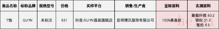 本次比較試驗對50款網(wǎng)購絲綢服裝的面料成分和含量進行檢測,結(jié)果顯示總體情況較好,僅有1款樣品,標(biāo)稱品牌為“GUYN”的T恤(標(biāo)稱銷售/生產(chǎn)商為昆明博訊服飾有限公司),雖宣稱面料為100%桑蠶絲,但實際并未測出含真絲成分。