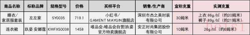 1??標(biāo)稱品牌為“左左家”的睡衣/居家服套裝(規(guī)格型號為SY0035,標(biāo)稱銷售/生產(chǎn)商為深圳市杰之美時裝有限公司),宣稱克重為30姆米,實測上衣克重約為20姆米,褲子克重約為21姆米;