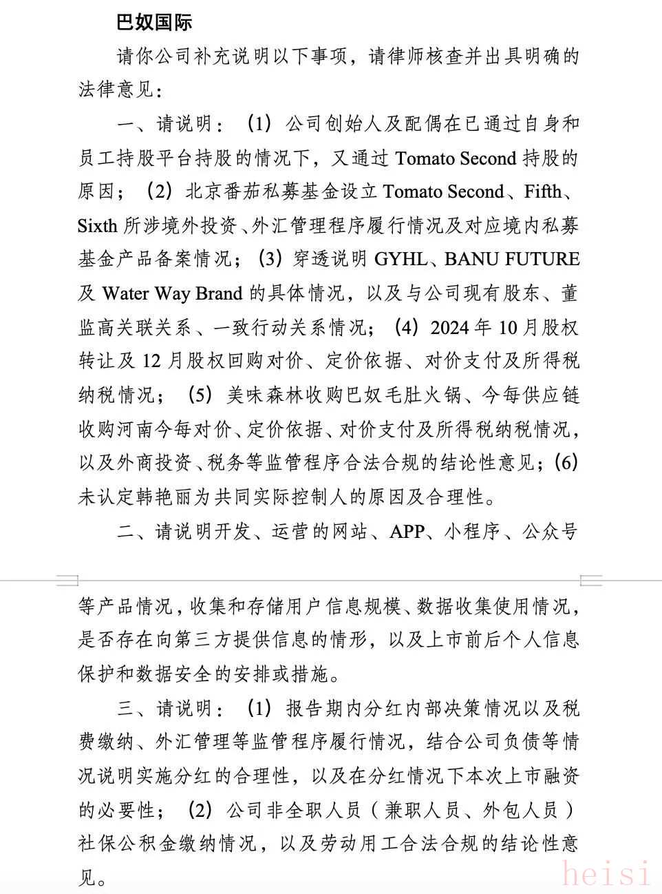 據(jù)銀莕財(cái)經(jīng)報(bào)道,近日,在向港交所遞交招股書近兩個(gè)月后,巴奴國際控股有限公司(以下簡(jiǎn)稱“巴奴國際”)收到中國證監(jiān)會(huì)補(bǔ)充材料要求,包括說明有關(guān)股權(quán)架構(gòu)合規(guī)性、數(shù)據(jù)安全及分紅合理性三大類共9個(gè)方面的事項(xiàng)。