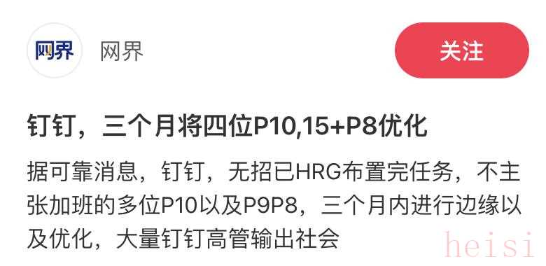 據(jù)新浪科技,8月20日,互聯(lián)網(wǎng)博主“網(wǎng)界”發(fā)文,稱釘釘將對(duì)多位不主張加班高管進(jìn)行優(yōu)化。其表示有可靠消息,目前,釘釘CEO無招已經(jīng)布置完任務(wù),涉及4位P10以及15位P8級(jí)別以上員工,三個(gè)月內(nèi)會(huì)進(jìn)行邊緣或者優(yōu)化。
