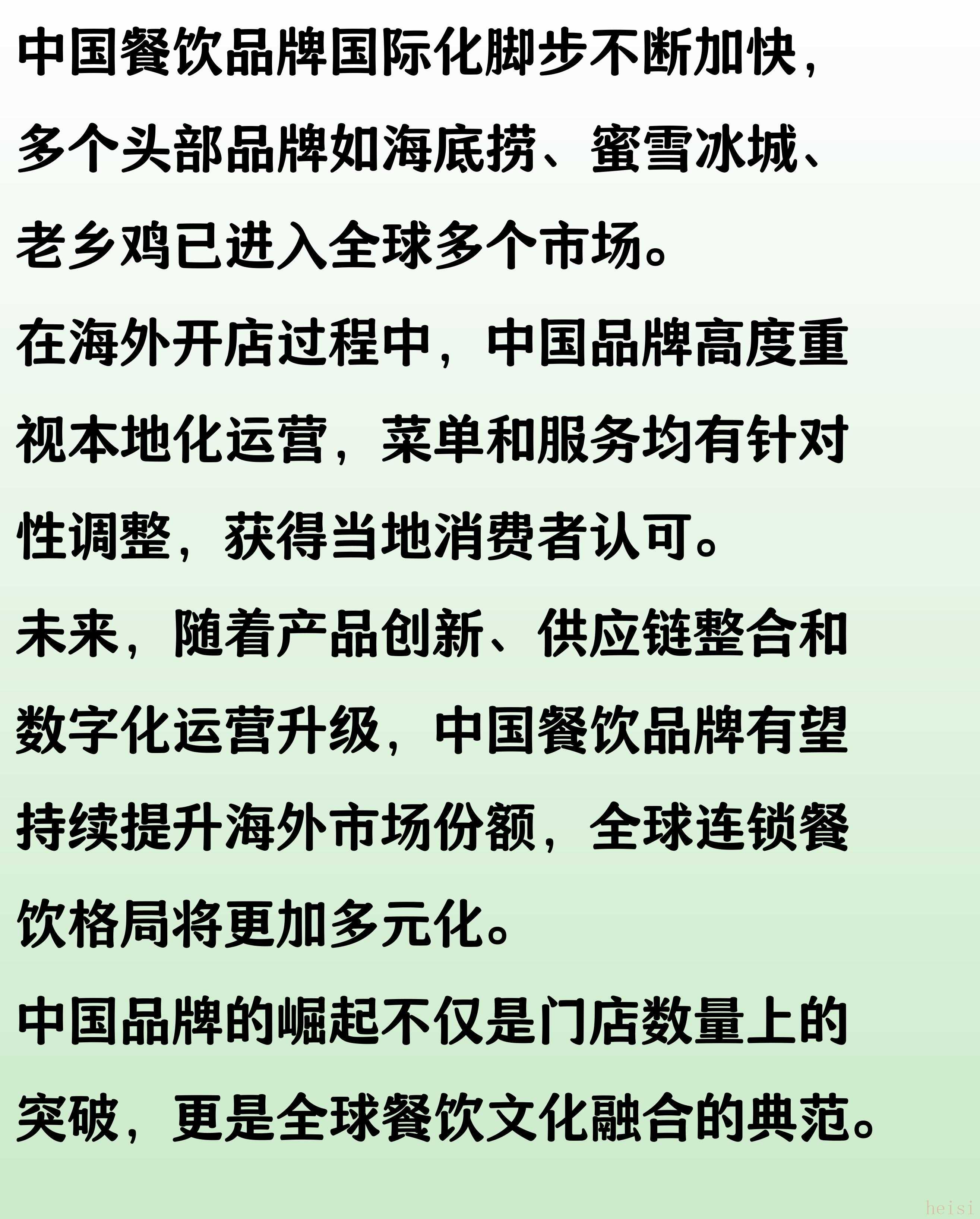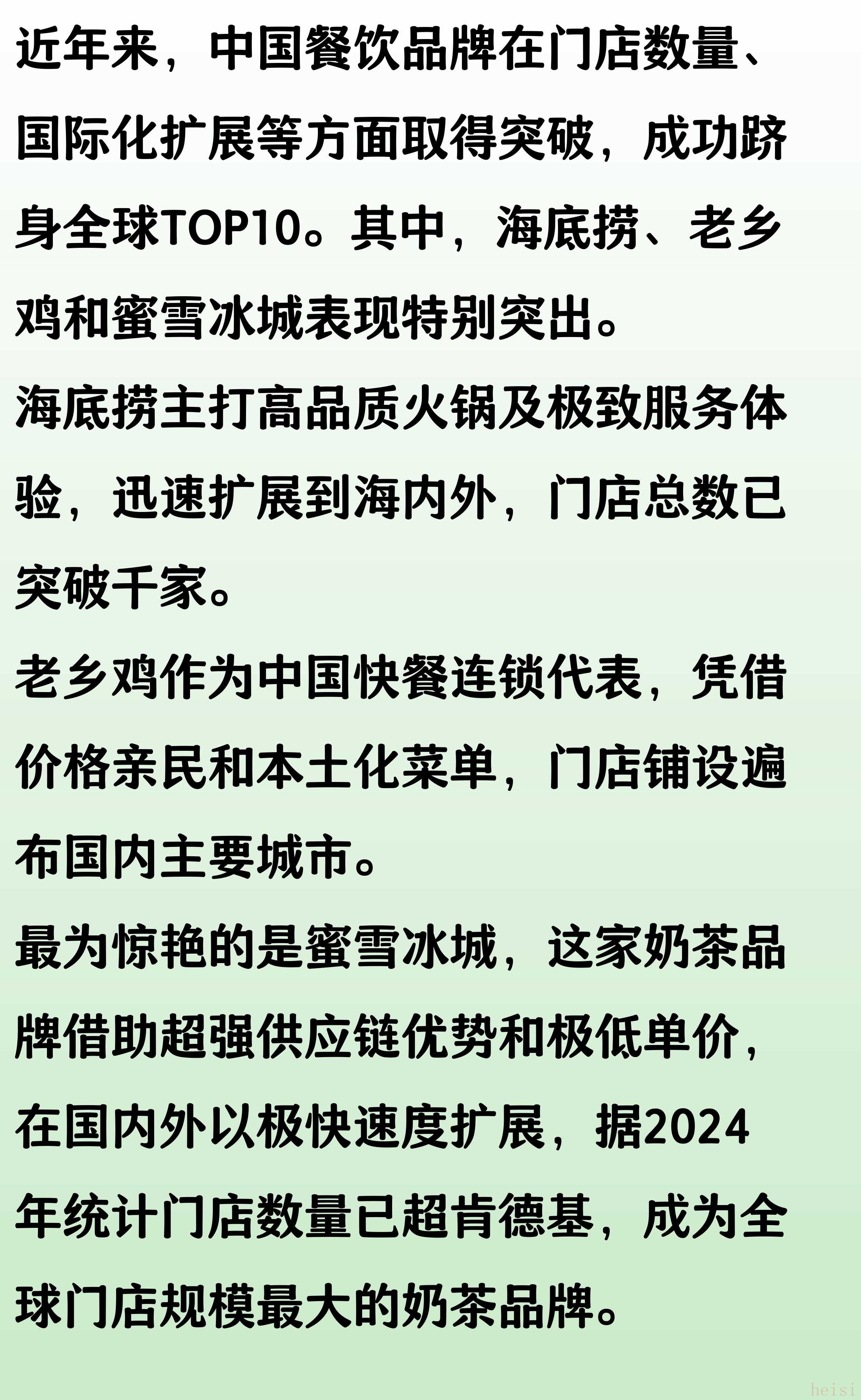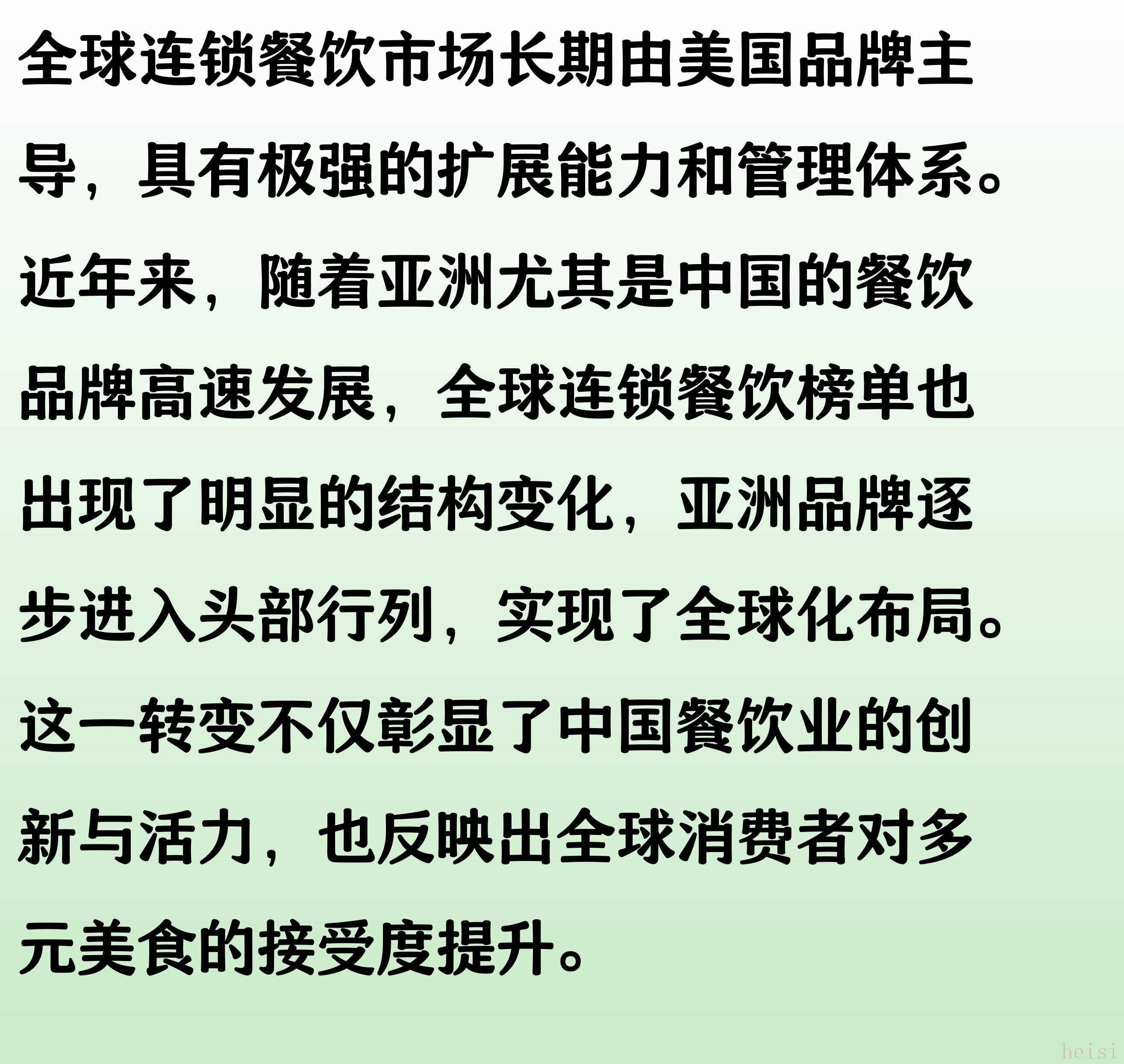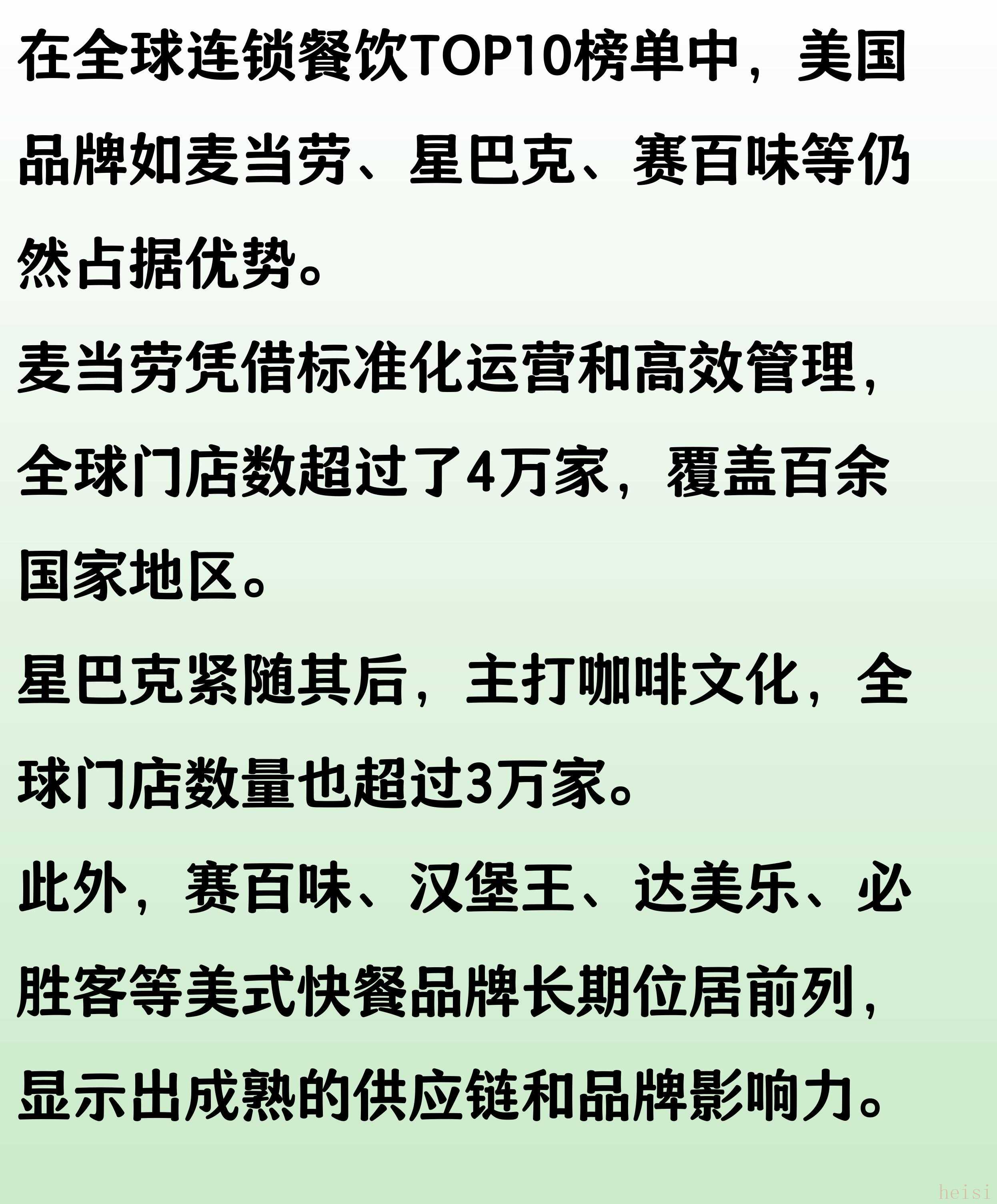 6. 中國(guó)連鎖餐飲品牌(具體名稱未提及):另一個(gè)中國(guó)連鎖餐飲品牌也躋身全球TOP10,展示了中國(guó)餐飲市場(chǎng)的強(qiáng)大實(shí)力。