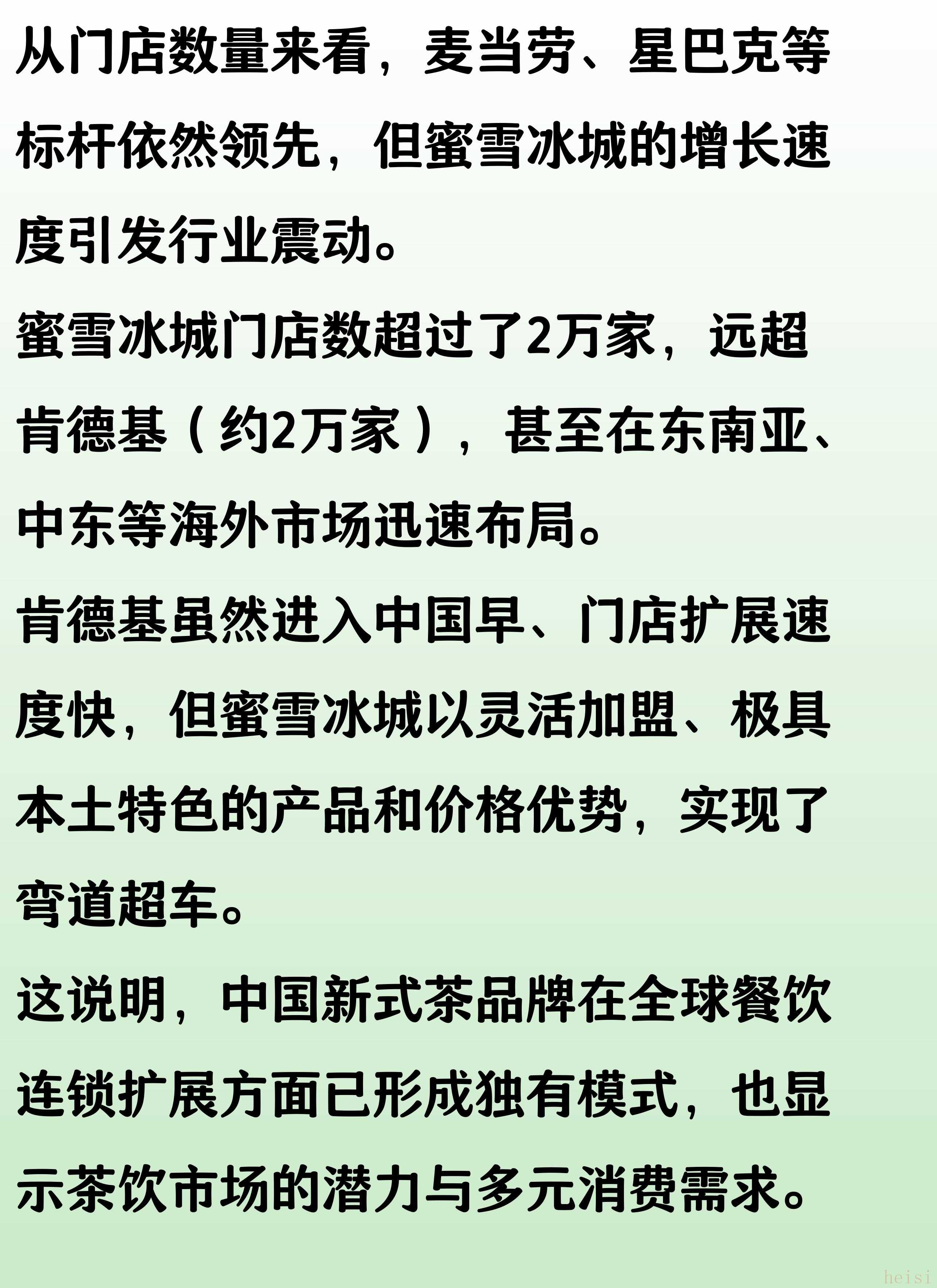 根據(jù)最新的全球連鎖餐飲品牌排名,中國(guó)在全球餐飲市場(chǎng)中占據(jù)了重要地位,有3個(gè)品牌躋身全球TOP10。值得一提的是,有一個(gè)中國(guó)的奶茶品牌在門(mén)店數(shù)量上超過(guò)了肯德基,成為全球最大的餐飲品牌之一。